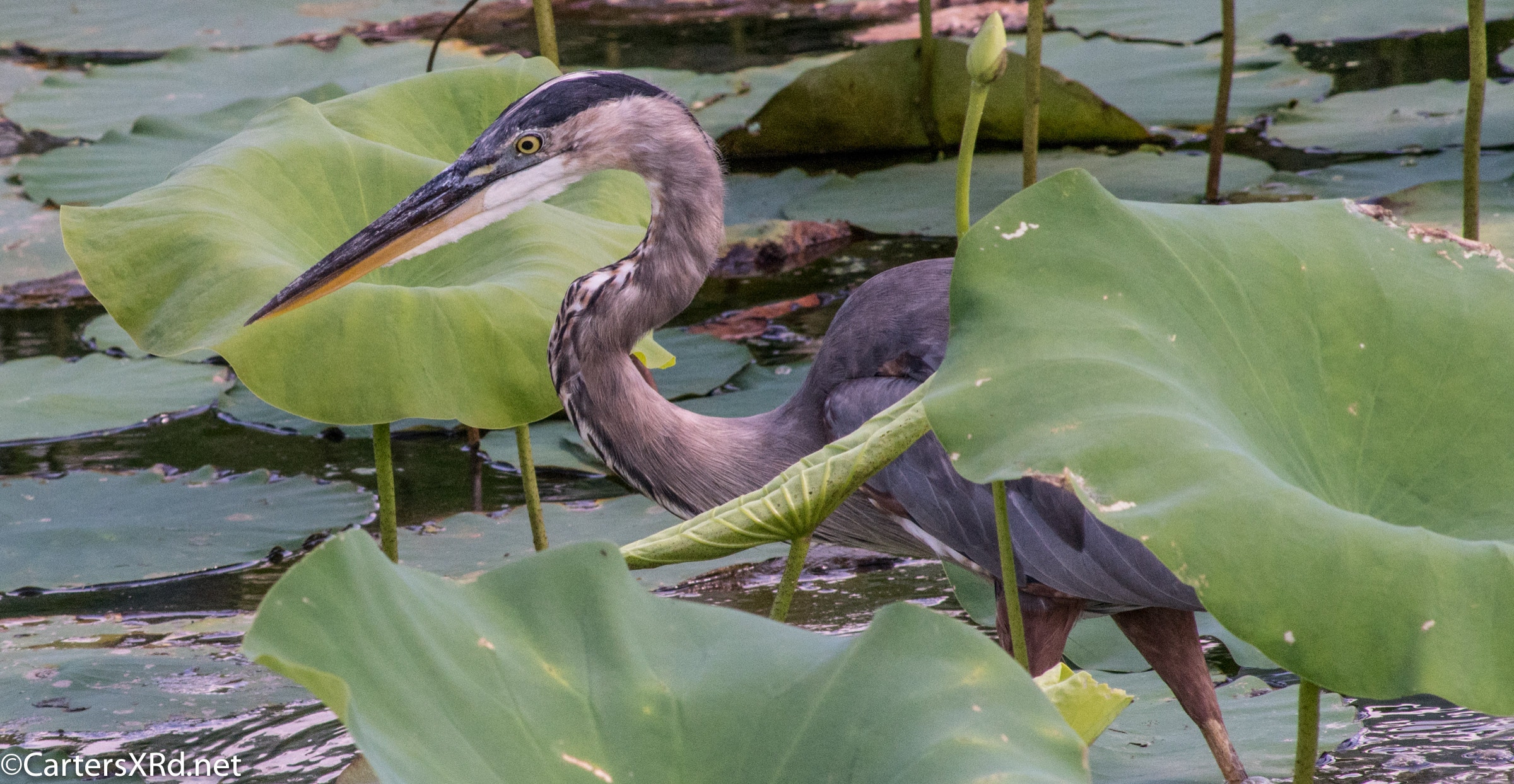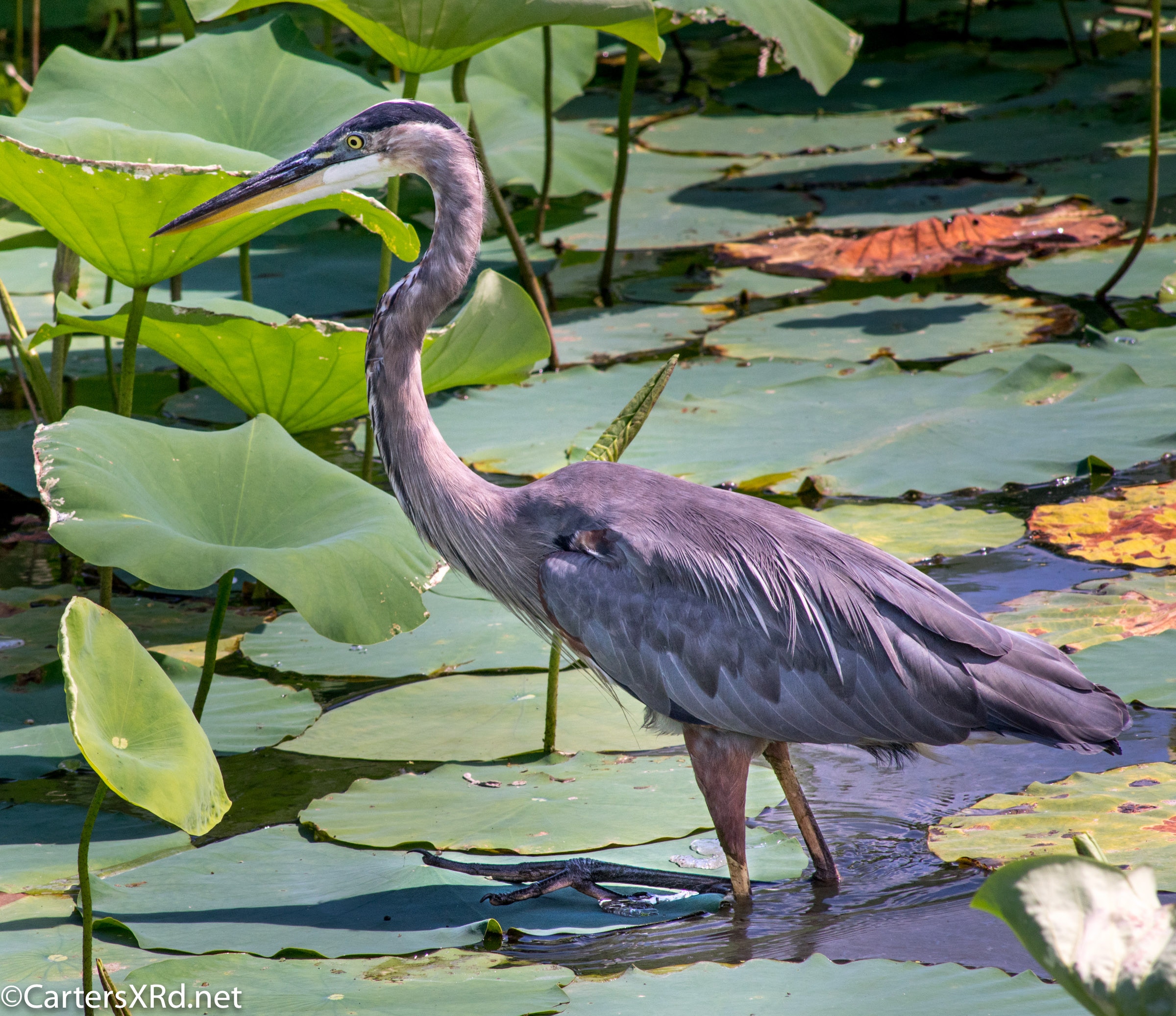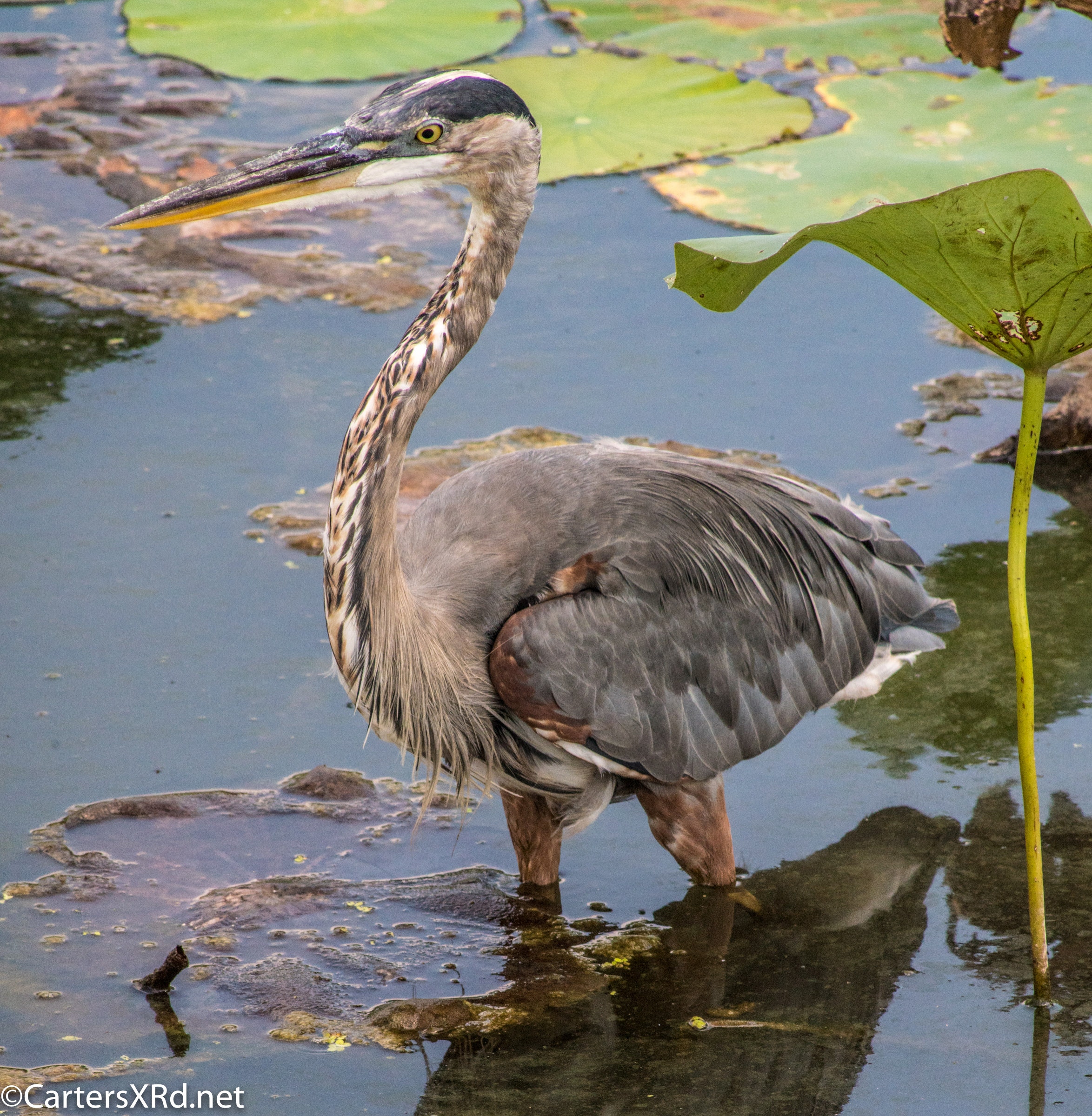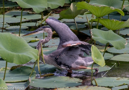 WASHINGTON, NC —Little Washington has a lovely boardwalk that circles a natural storm water treatment pond (swamp) filled with turtles and birds and fish. Among the residents this summer was a young great blue heron who loved a camera. Below are a series of photos I took for his modeling book. I took these photos August 11, 2018.