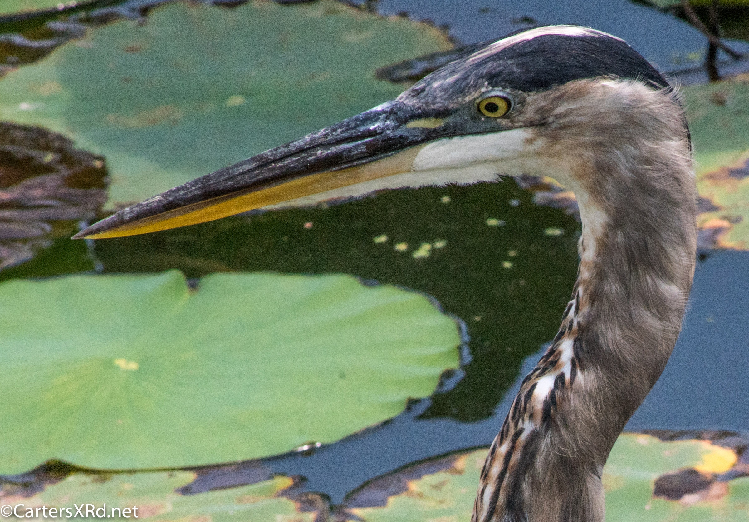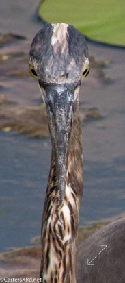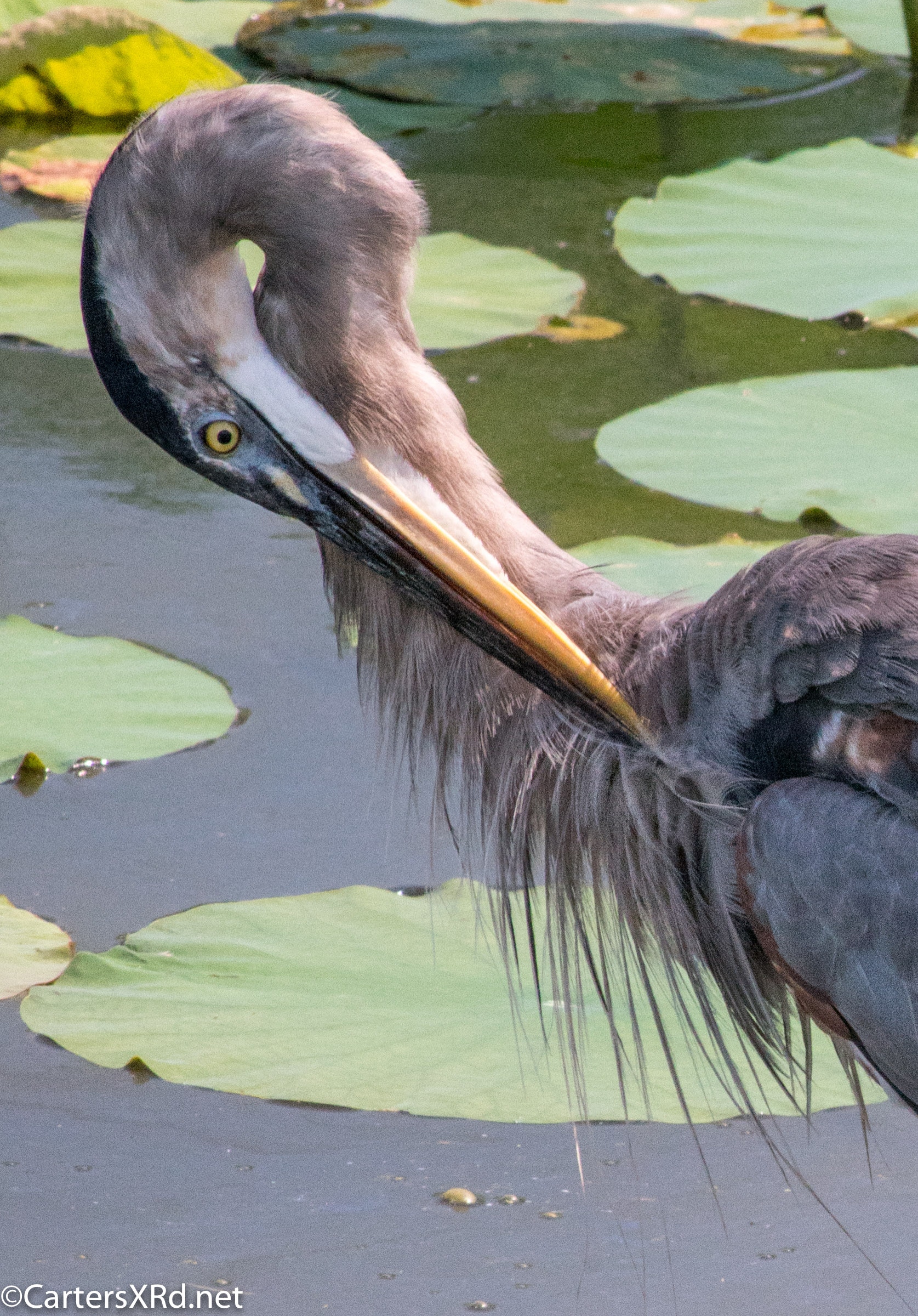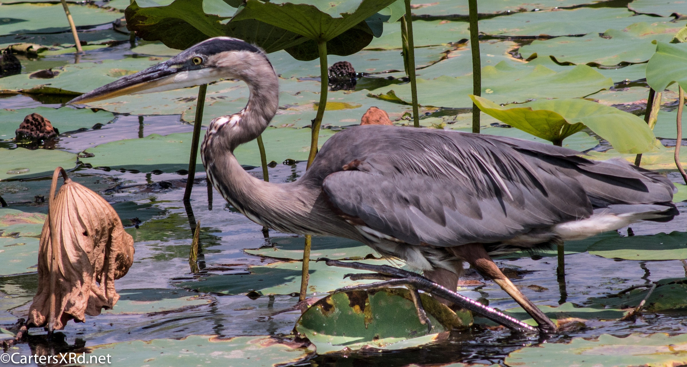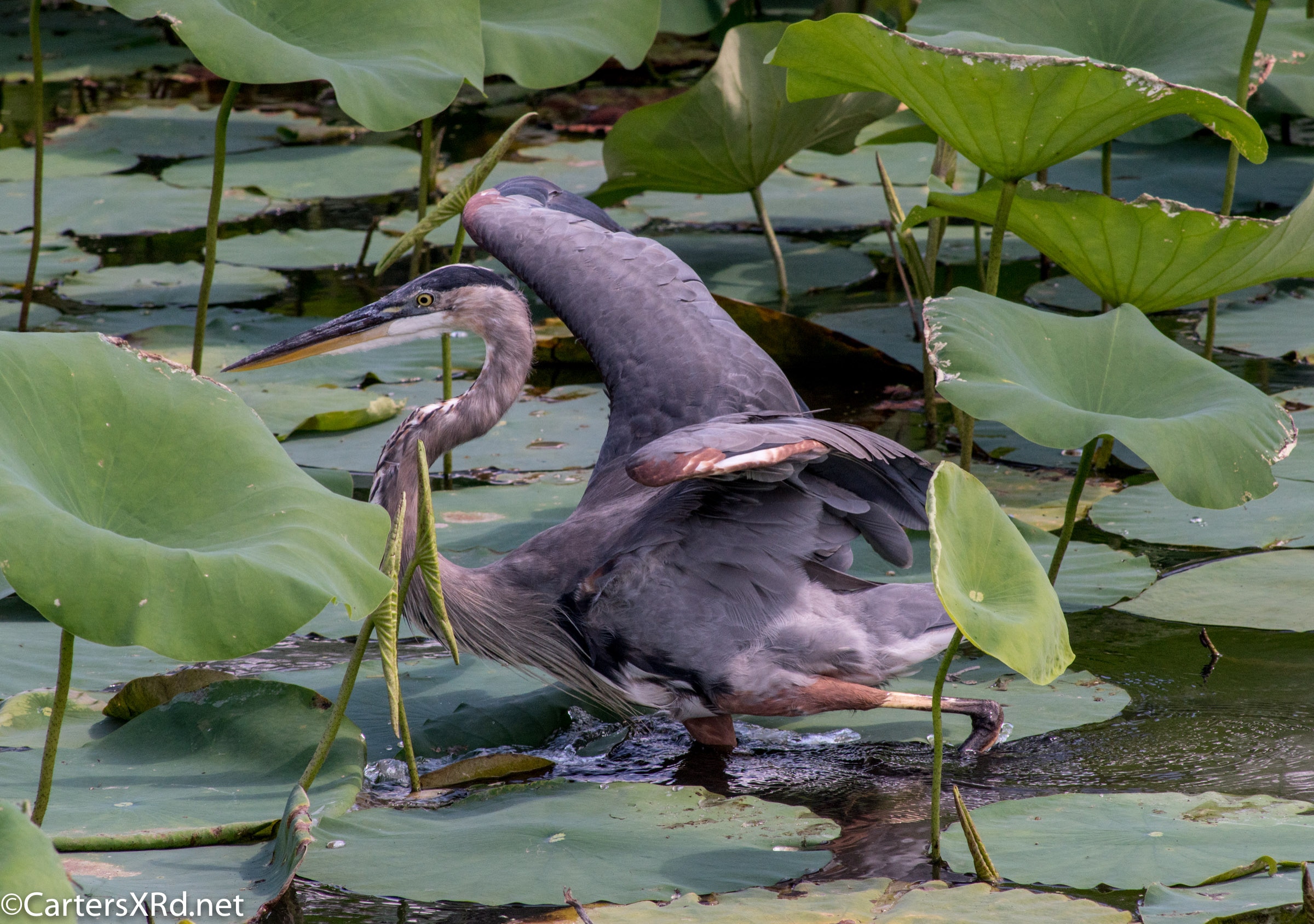 WASHINGTON, NC —Little Washington has a lovely boardwalk that circles a natural storm water treatment pond (swamp) filled with turtles and birds and fish. Among the residents this summer was a young great blue heron who loved a camera. Below are a series of photos I took for his modeling book. I took these photos August 11, 2018.