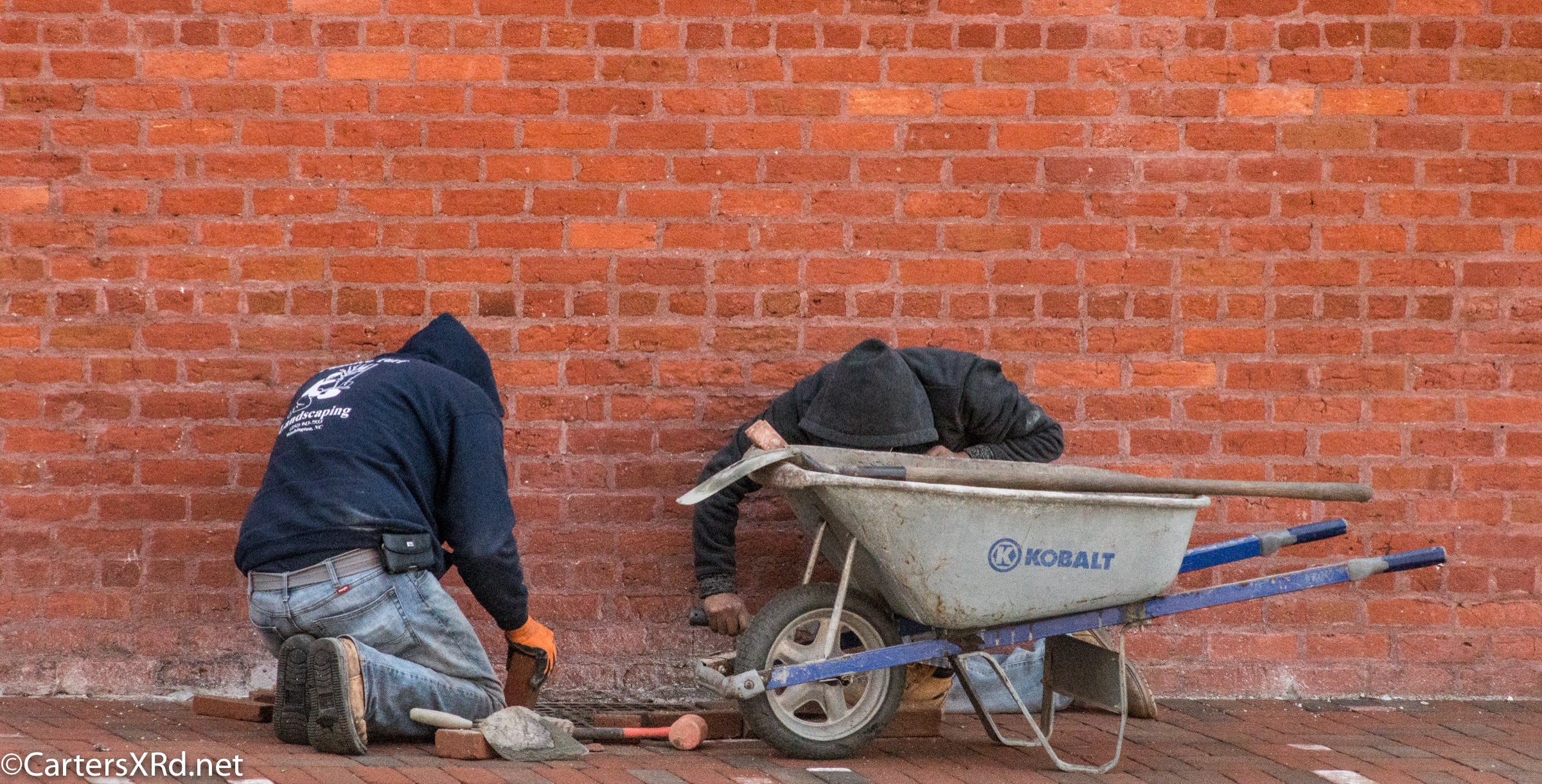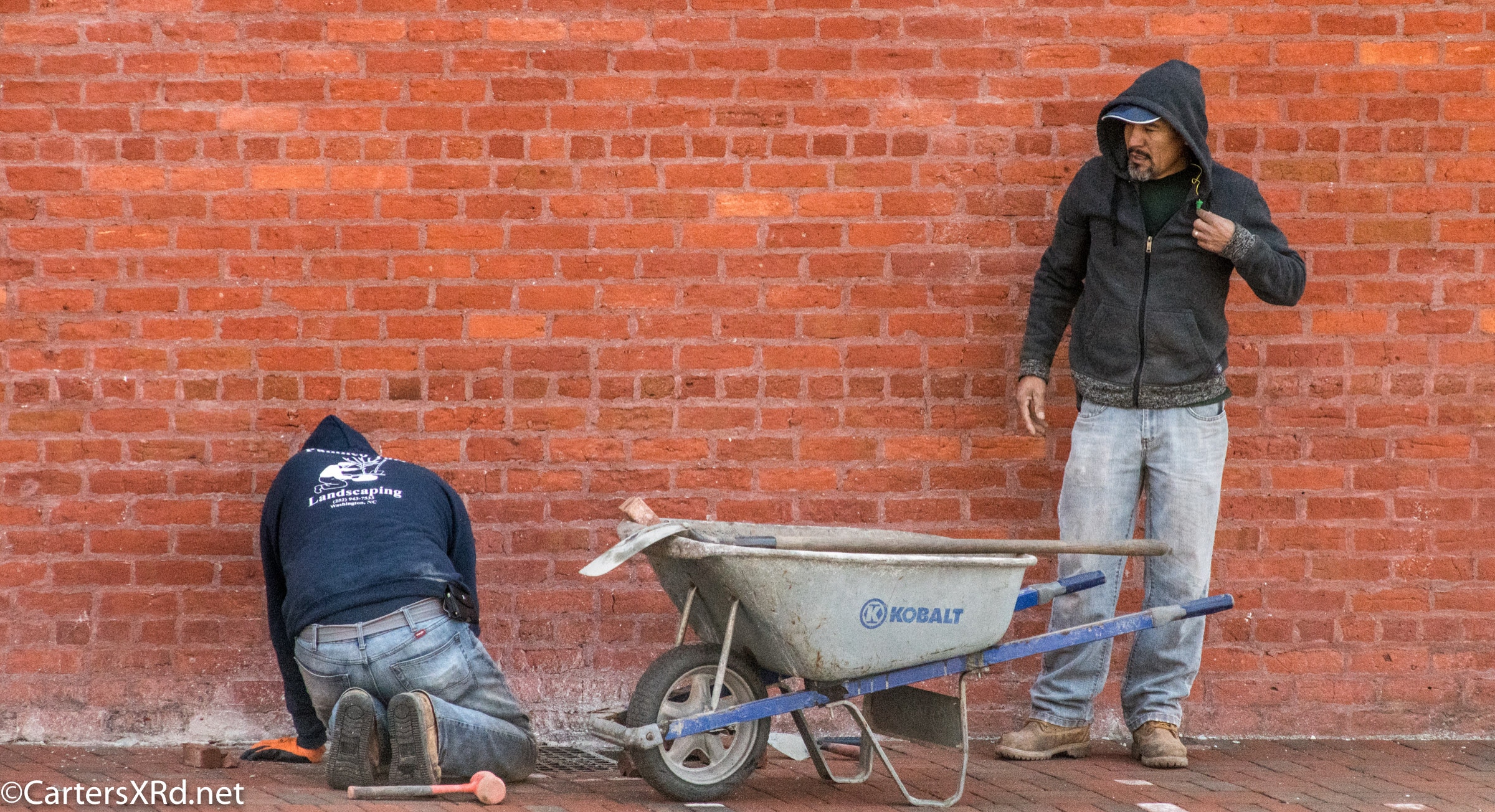 Bricklayers repair sidewalk on Gladden Street in Little Washington.