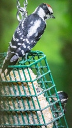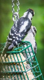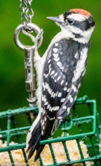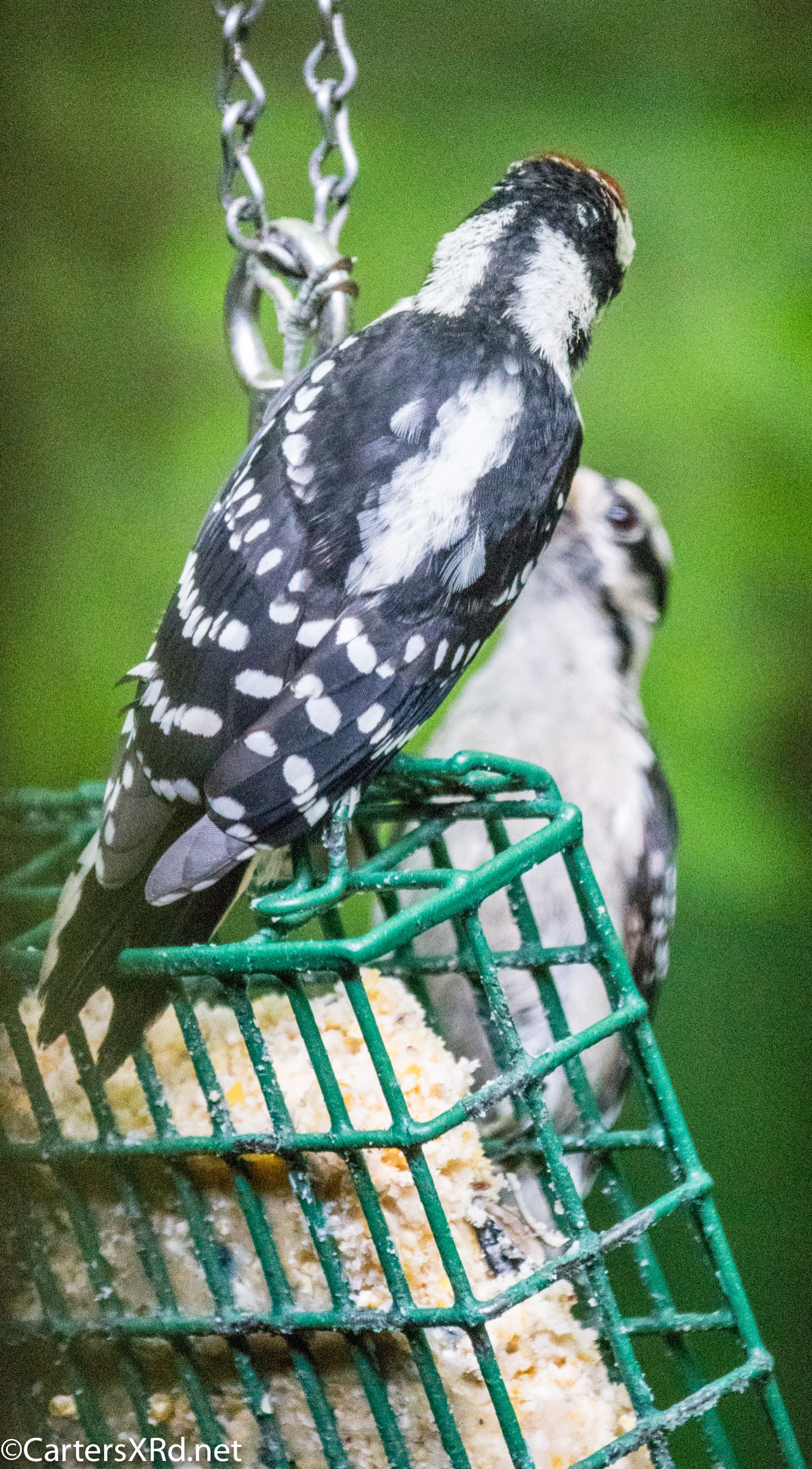 A young downy woodpecker learns about a woodpecker diner from his mom.