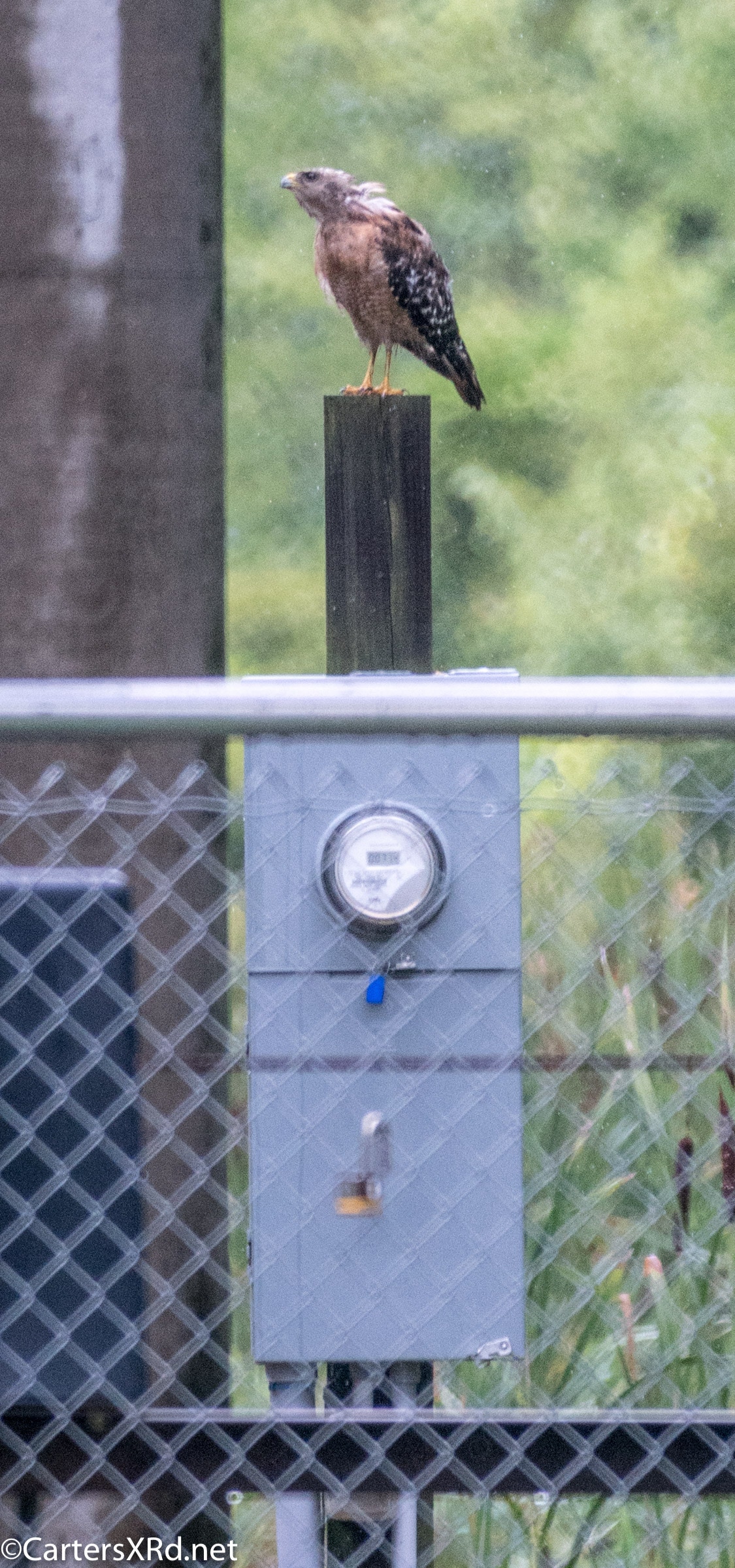 Meter guarding red-shouldered hawk