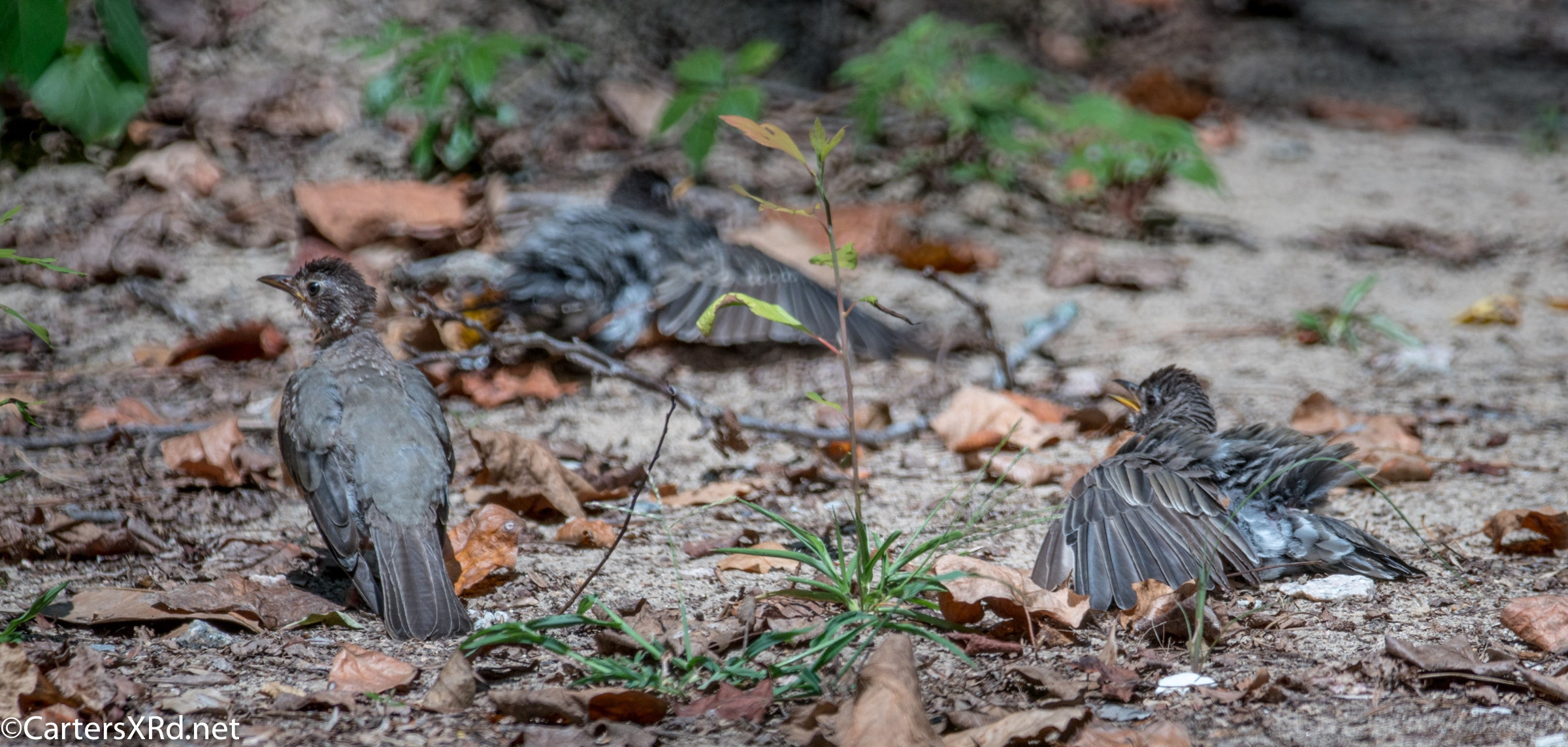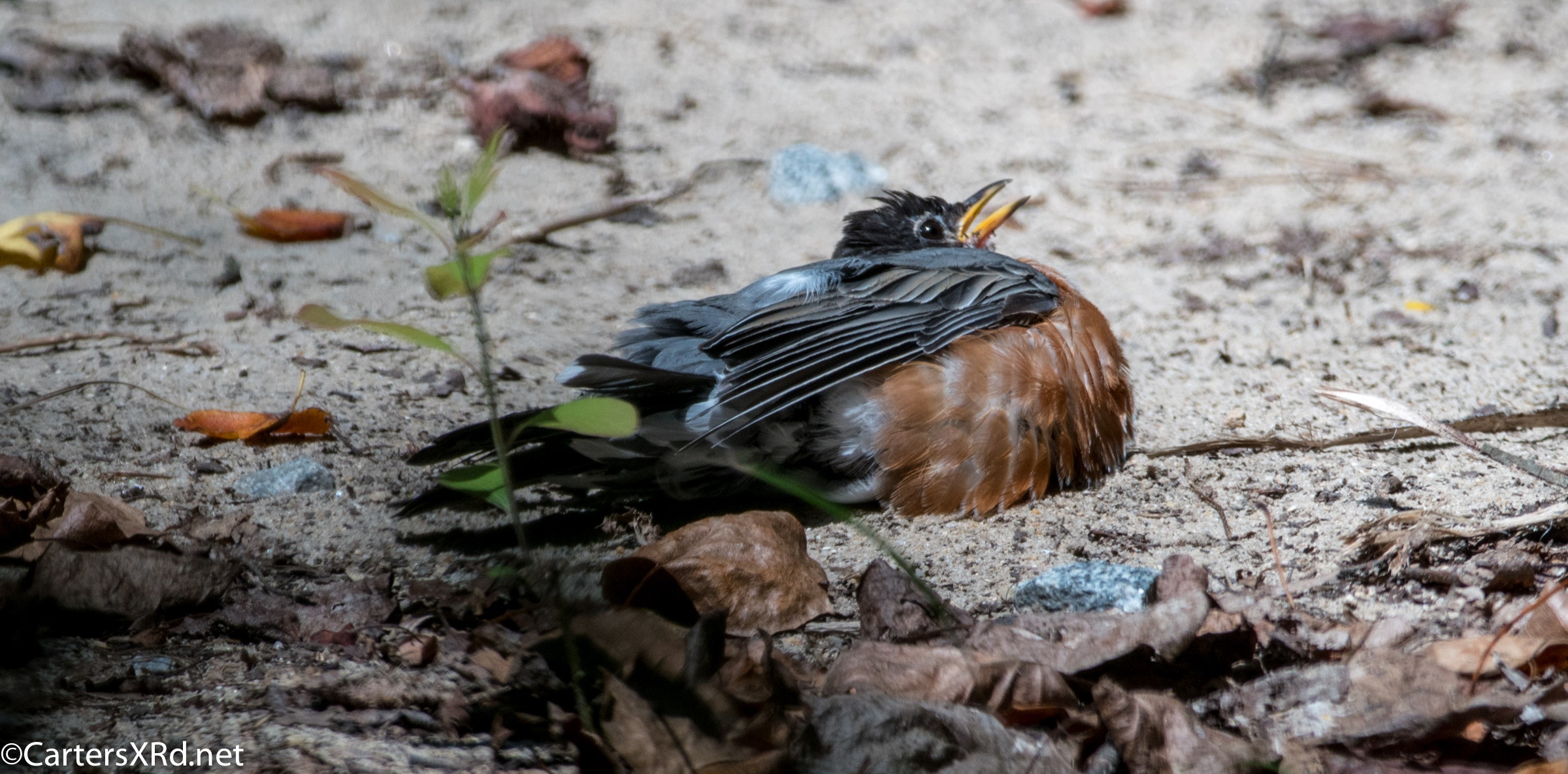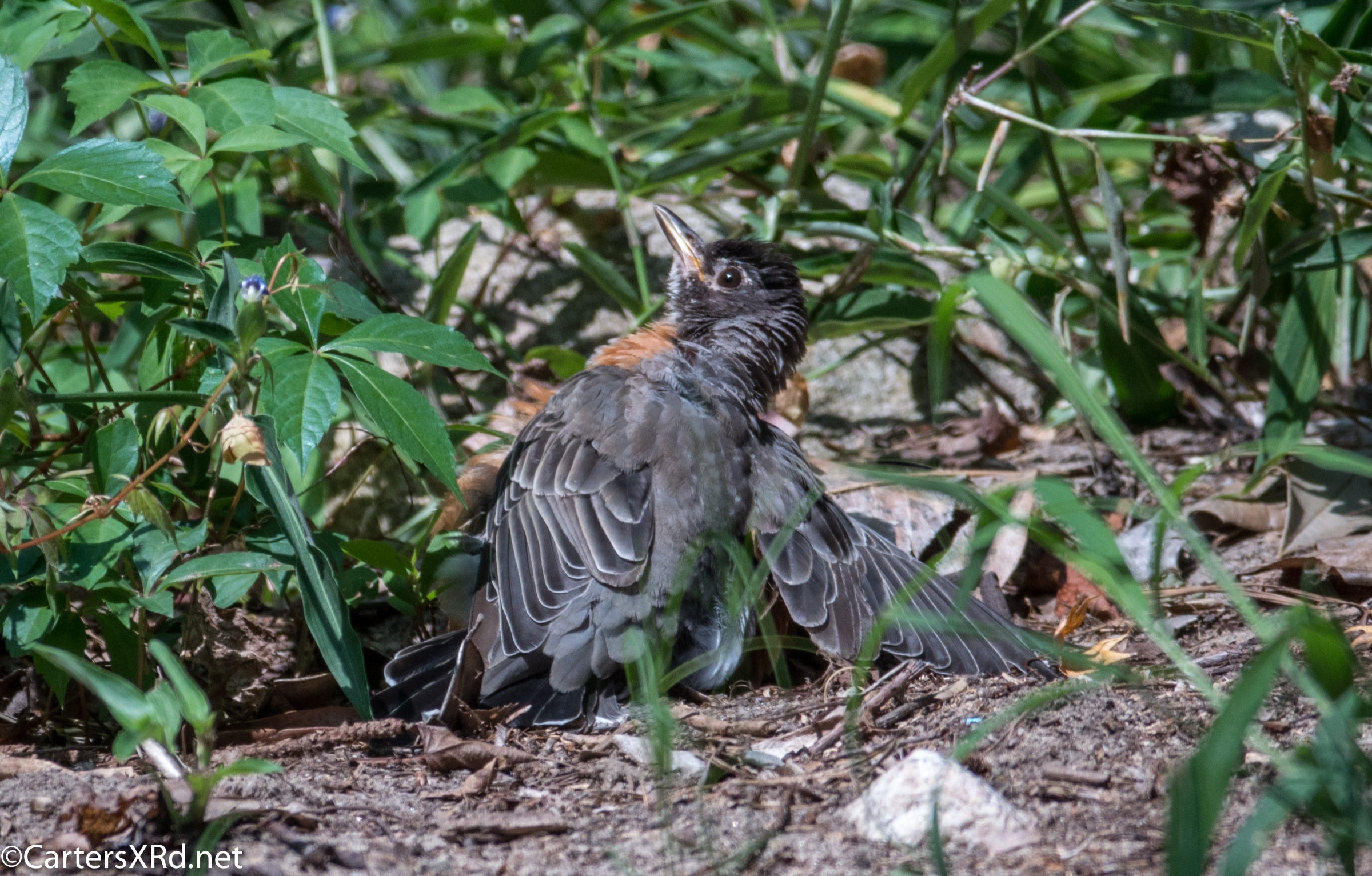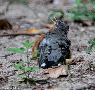 WASHINGTON, NC — Back on August 27, a flock of Robins appeared in our yard. One or two played in the birdbath. But, more than a dozen bellied down in the sand of the yard. They struck bizarre poses which they held for minutes. There was little fluttering I expect from dirt baths. The best guess I have is that they were anting — letting ants crawl between their feathers and carry off lice and bits of dead skin. It is said to be soothing for birds, especially when they are molting. Click any photo to enlarge it.