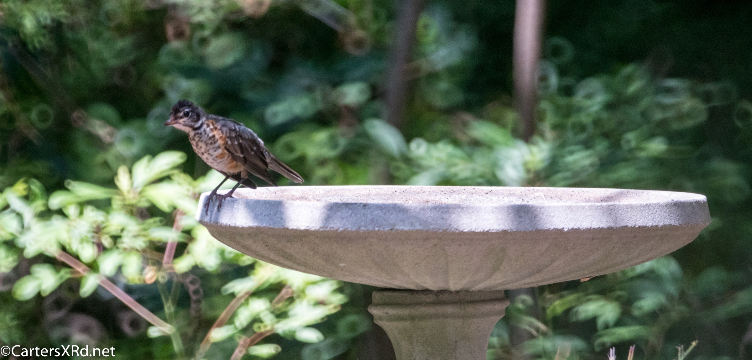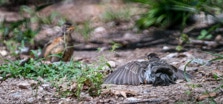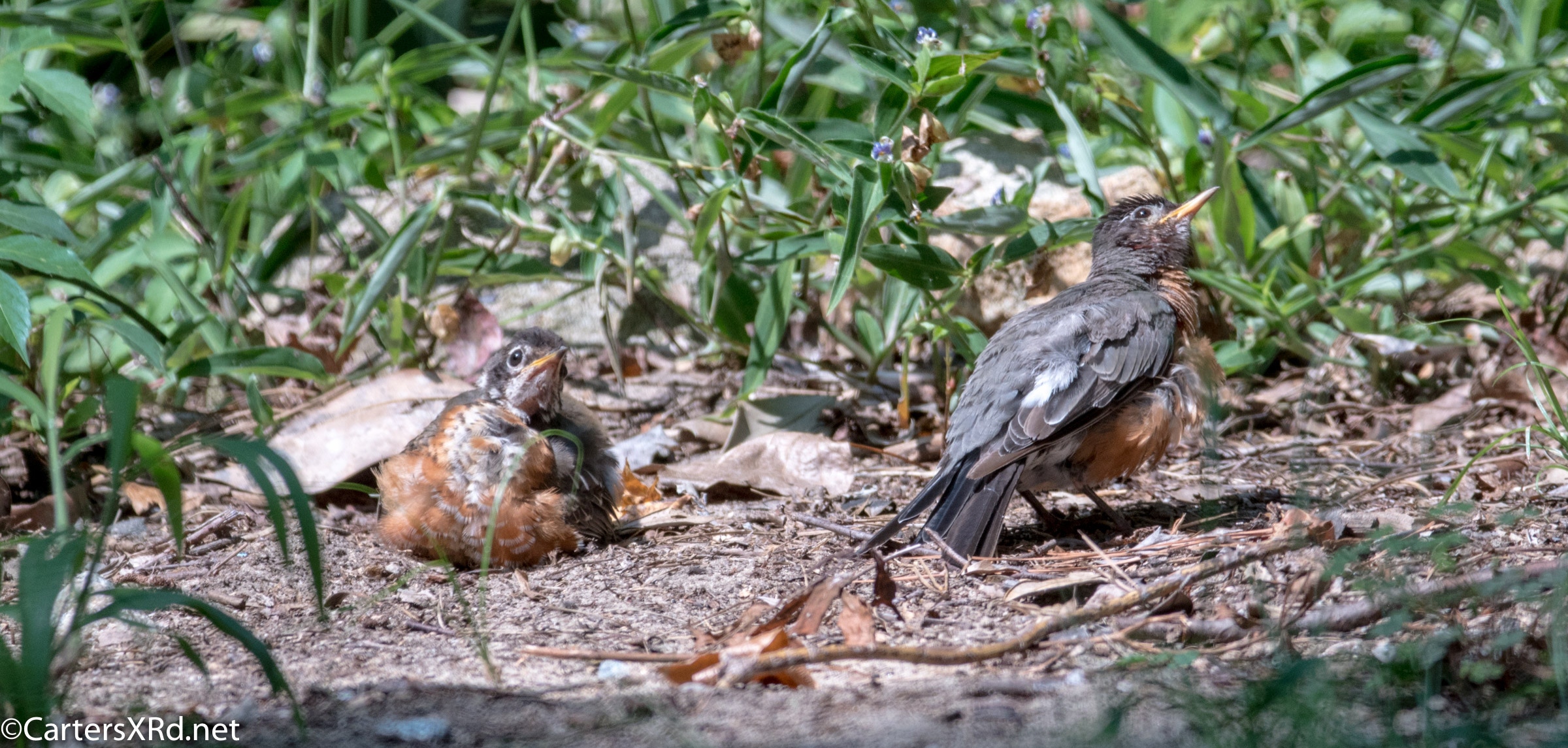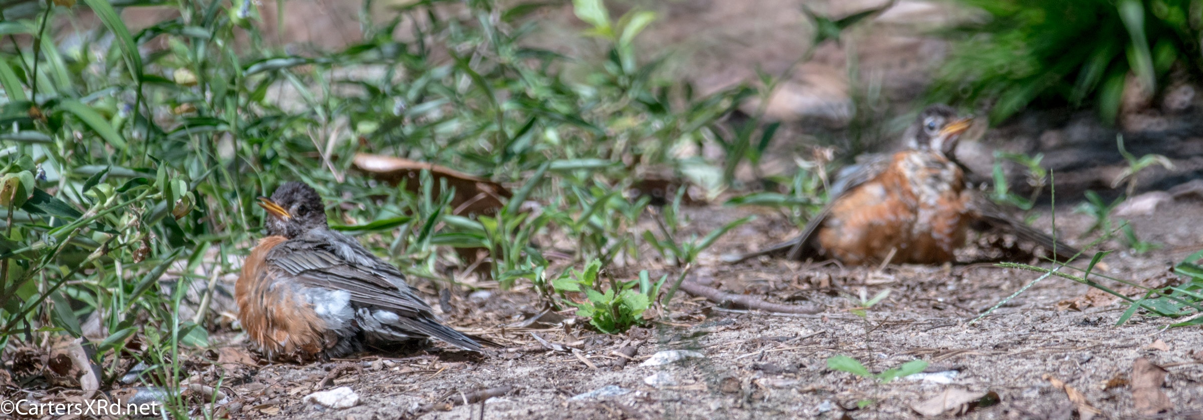WASHINGTON, NC — Back on August 27, a flock of Robins appeared in our yard. One or two played in the birdbath. But, more than a dozen bellied down in the sand of the yard. They struck bizarre poses which they held for minutes. There was little fluttering I expect from dirt baths. The best guess I have is that they were anting — letting ants crawl between their feathers and carry off lice and bits of dead skin. It is said to be soothing for birds, especially when they are molting. Click any photo to enlarge it.