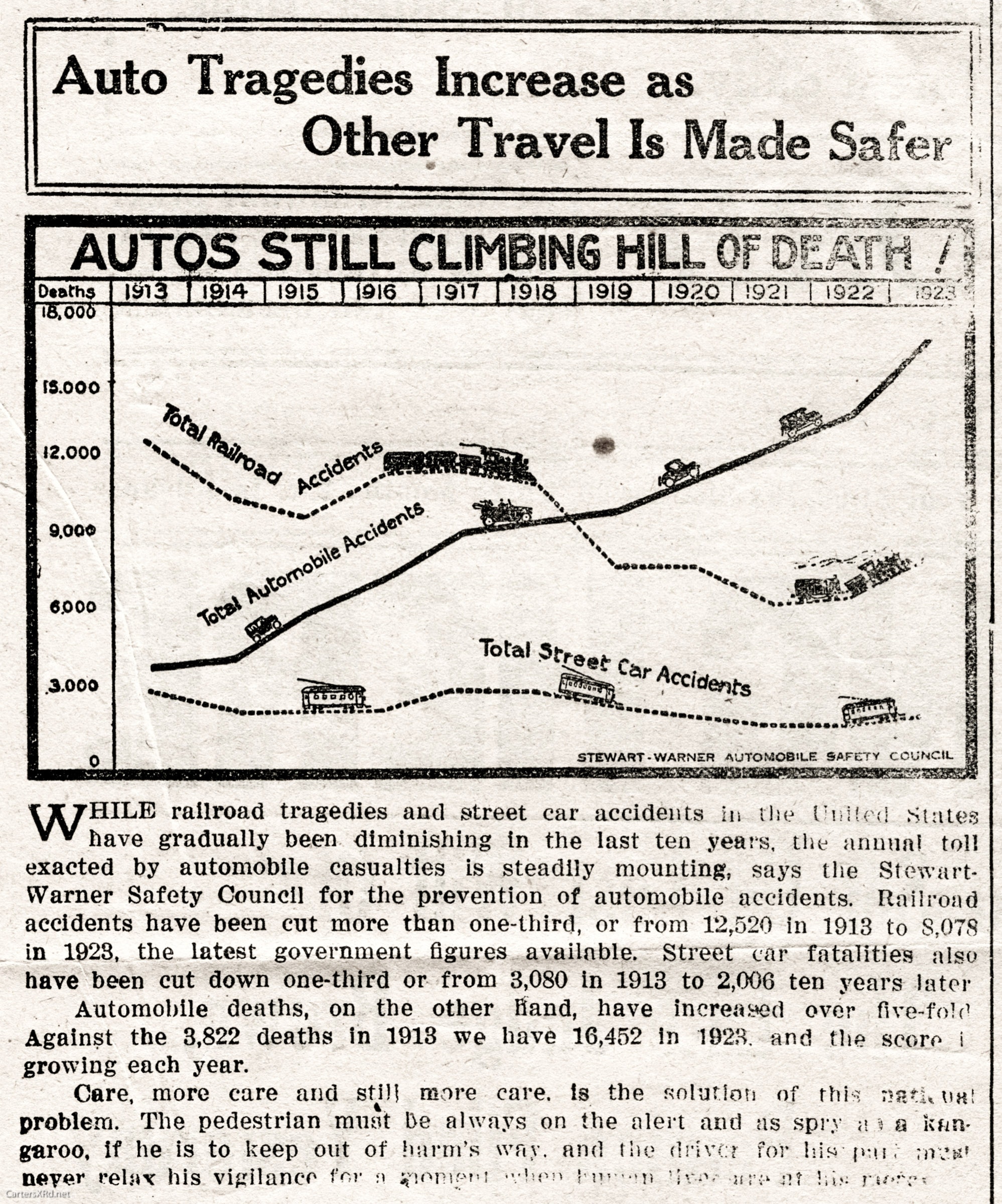 Found this article on vehicle safety in a 1926 Washington Daily News. It shows the rise of the automobile popularity and increasing safety of the country’s railroads. More than 37,000 people were killed in US auto accidents in 2016. Click on any photo to see it larger.
