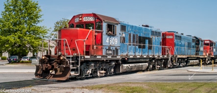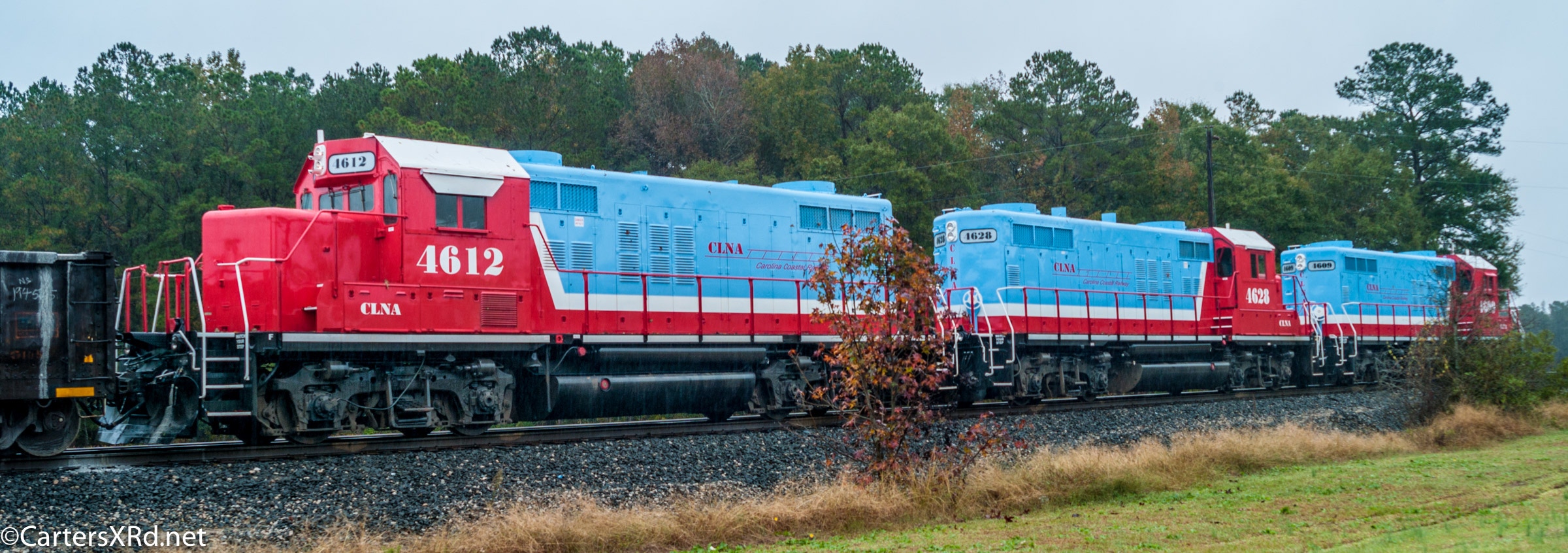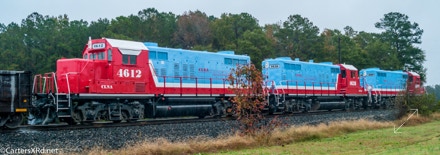 Carolina Coastal has run some rust-buckets in its time. Among them was this trio of 1957 GP9s which served earlier on the Grand Trunk Western.They carried their old colors for quite a while until getting painted a few years back. They are a lot prettier now, but I sure do miss that old orange and blue. Here is the same team on CLNA 120 in the same order before and after the new plumage.