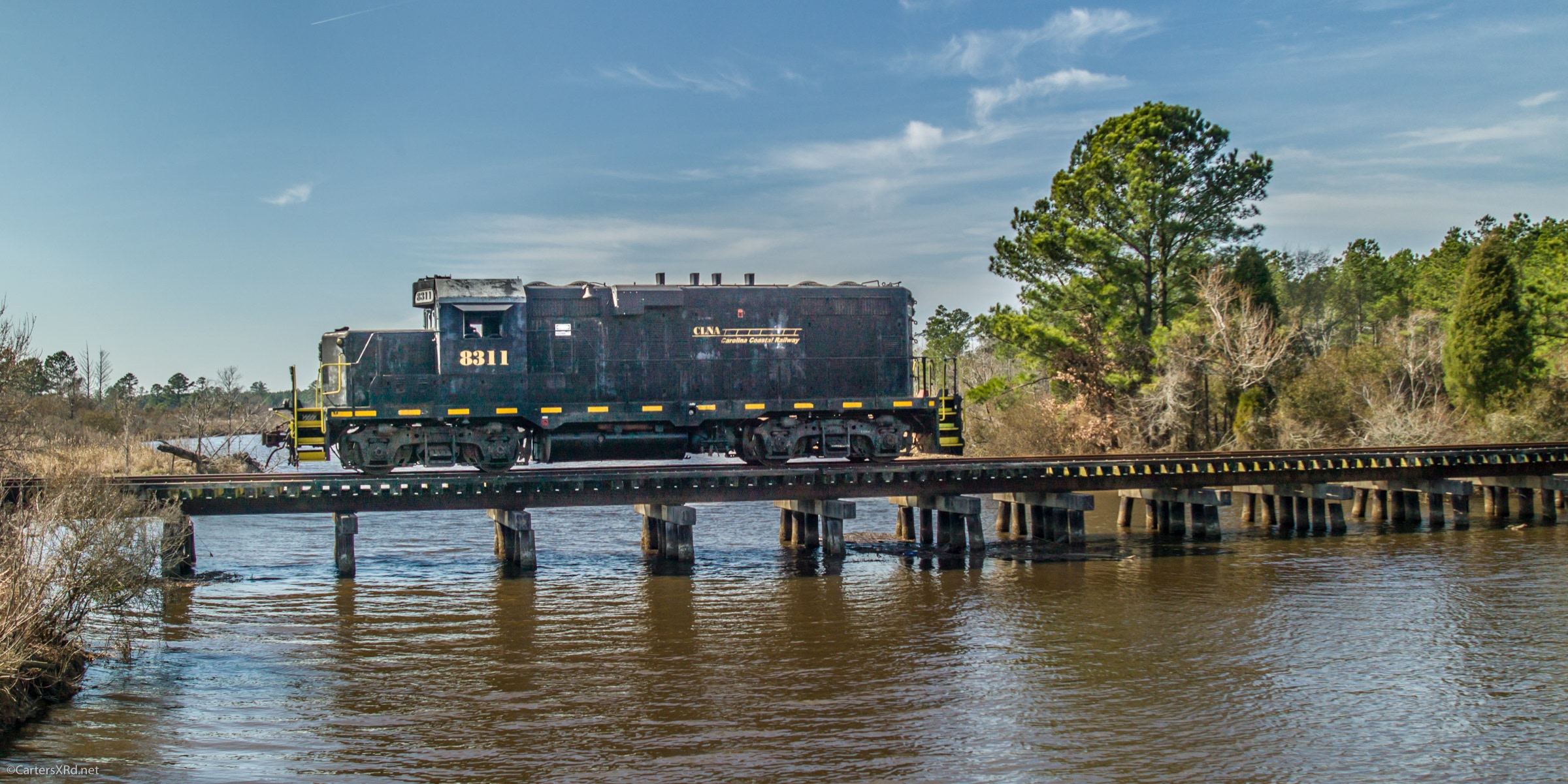 BELHAVEN, NC — After dropping off several cars of fertilizer in Belhaven, CLNA 165 heads back toward Pantego where it will pick up a string from Bishops Crossing put aside behind the old Academy. This old 1954 EMD GP10 arguably has the worst paint job in the state. The blackish color makes it a bitch to photograph in backlight. I took this photo February 16, 2018.