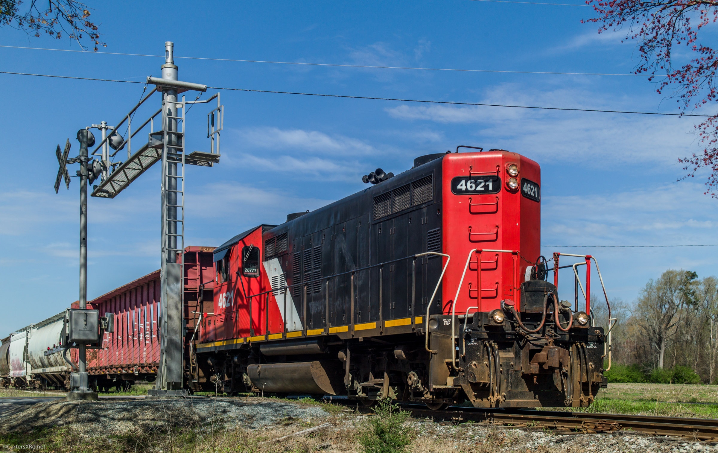WASHINGTON, NC — Took off chasing Carolina Coastal 119 headed home a moth or so ago. I was happy to catch this regular visitor — a 1957 GP9 still wearing her original Canadian National colors and cranking it up long hood forward.