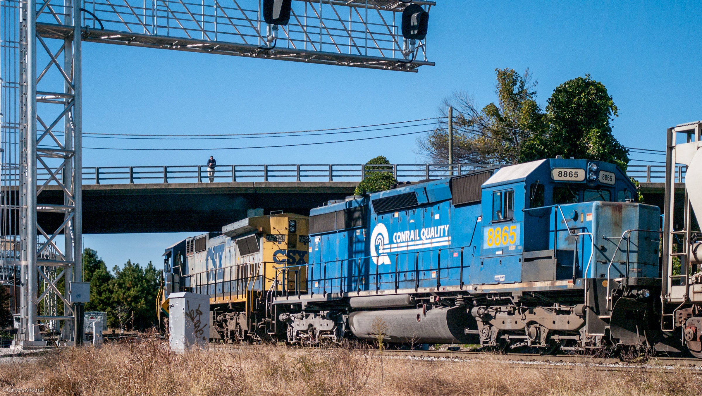 RALEIGH, NC —I photographed this CSX freight with a liberated Conrail 1979 SD40-2. at Boylan Wye in 2010.  According to some sources, it is one of the  last of its model to sport its old Conrail colors.