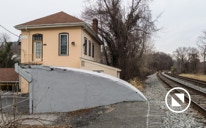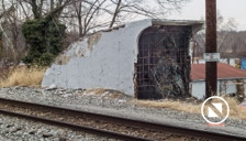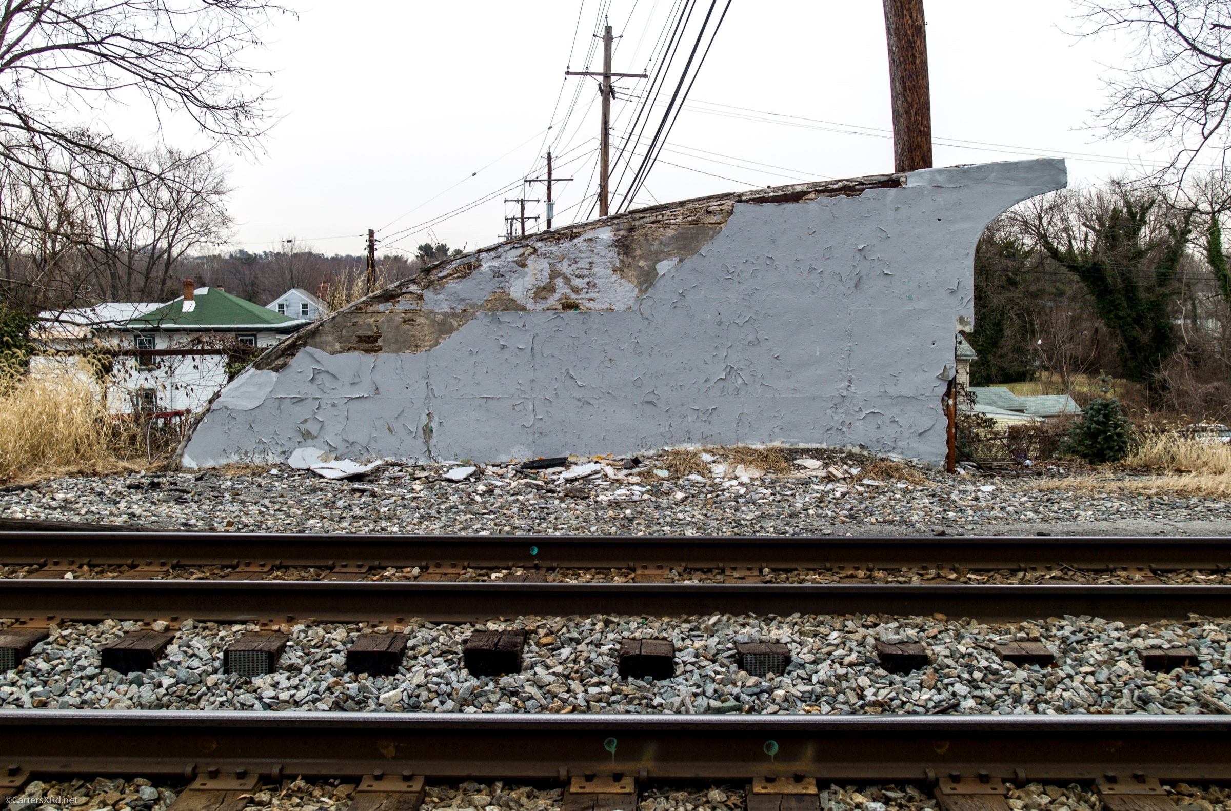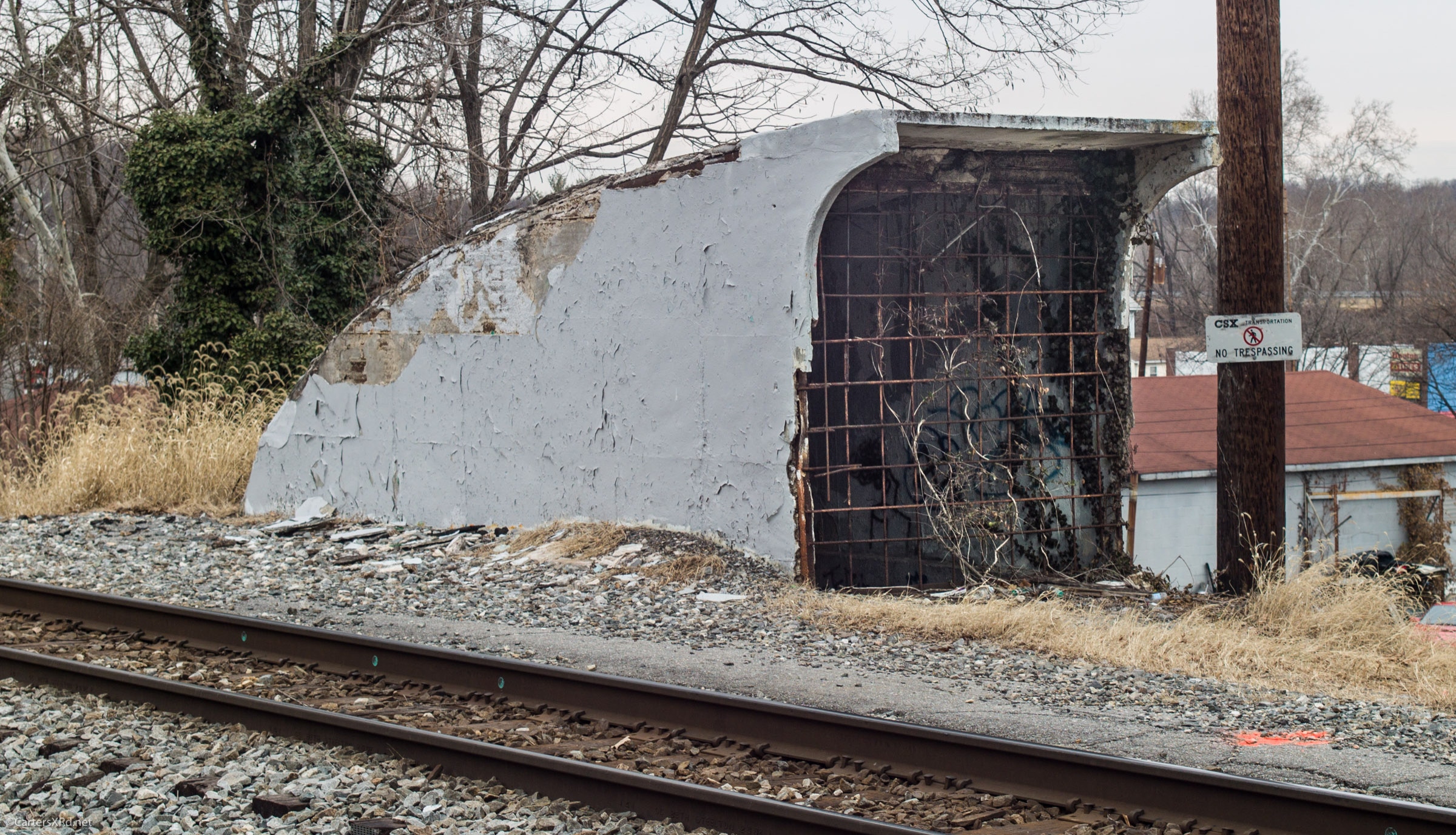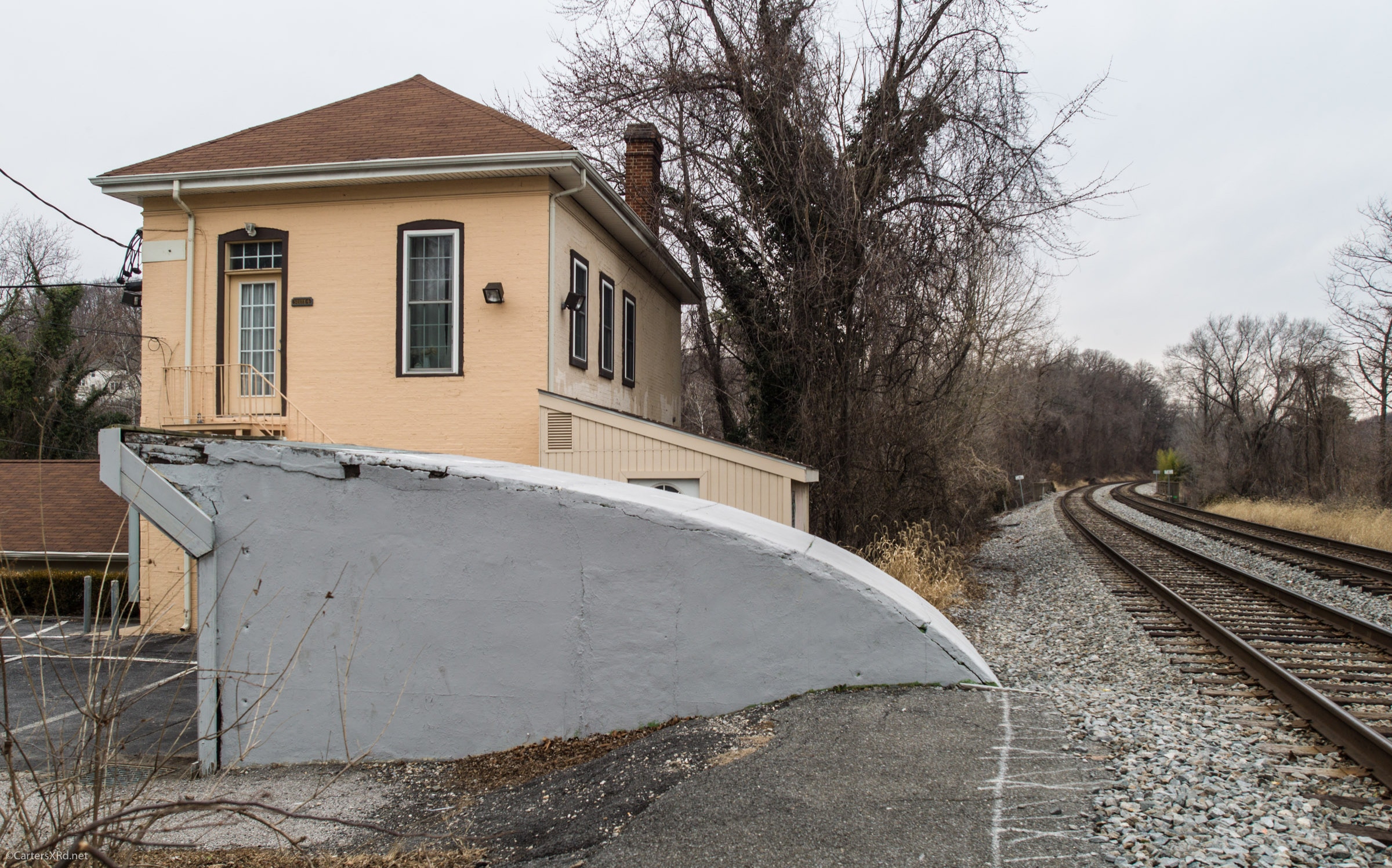 ELKRIDGE, MD— Once upon a time, Elkridge, MD had a passenger station. Shifting population centers closed it years ago. It did leave behind one marvelous piece of architecture — a passenger tunnel beneath the double track mainline that allowed riders to board both Washington and Baltimore-bound trains without the danger of crossing the busy tracks. Tunnel access is now sealed, but the ends of the tunnel are still there standing witness to better times. I took these pictures in early February 2018. All photos will enlarge to the size of your browser by clicking on them.