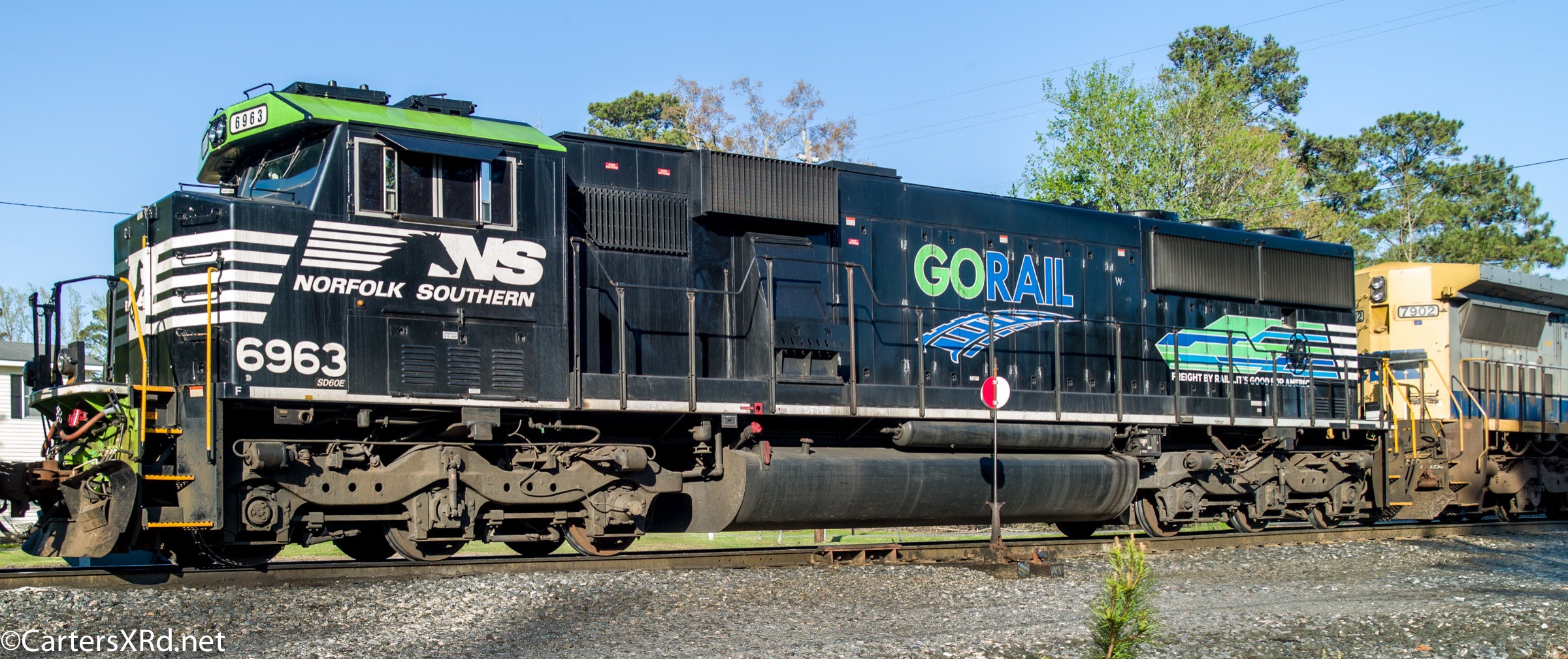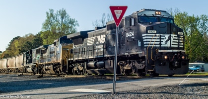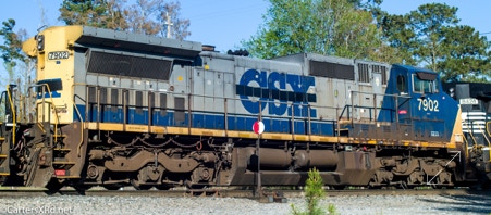 CHOCOWINITY, NC — Is was the good the bad and the ugly when I came back home through Marsden Yard this evening. I was very happy to see the GORAIL Heritage (?) Unit even if it was third in the lash-up. In the middle was a redacted CSX (now GECX) CW40-8. On point was an old Conrail C40-8W now wearing black and white rearing mustang colors. I’m not sure, but it looks like they’ll be going out on E51 tonight.