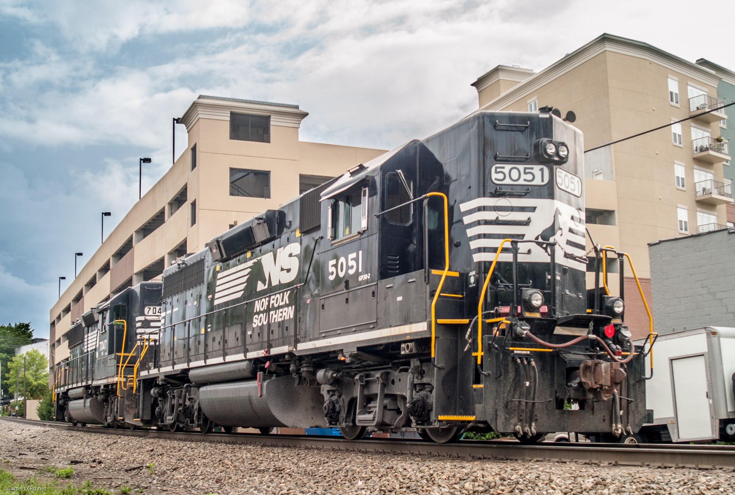 RALEIGH, NC — This pair of .high hood EMDs. The 1972  GP38-2 and 1980 GP50 are headed from Boylan back to Glenwood yard. Both are veterans of the old SOU. I took this photo in 2012.