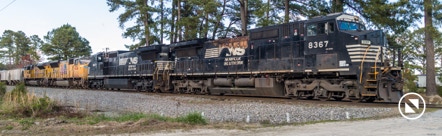 CHOCOWINITY, NC —Looks like we may have a couple of BNSF natives with us in Marsden Yard for a couple of days. E51 is heading out with a couple of black & white Dash-8s leading two Union Pacific locos. She’s under the overpass on the back end, and the lead is at mile post 1.