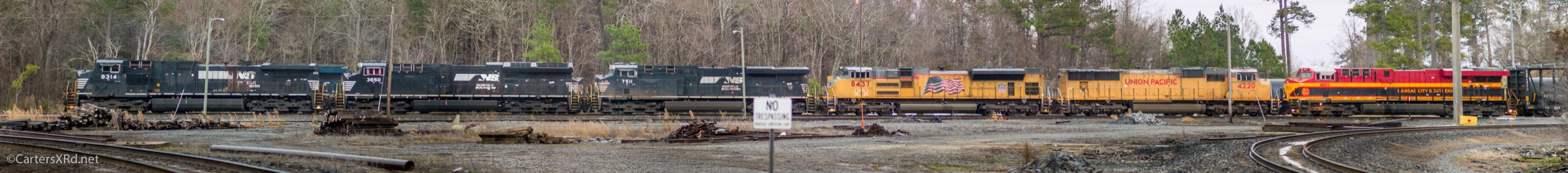 CHOCOWINITY, NC — There were all sorts of weird moves in Marsden Yard today. There was no traffic late yesterday afternoon. This morning shuffling was heavy enough that Carolina Coastal was delayed by more than two hours getting in the yard. While five units sat in the yard, E49 arrived with two Union Pacific and one Kansas City Southern. They were immediately melded with three of the in-yard units to make a six-unit lashes. Here they are just beginning to build a train that is expected to go back out tonight.