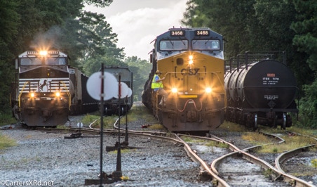 CHOCOWINITY, NC — Norfolk Southern’s E53 was still working Marsden Yard when CSX 727 reached the yard on it way to Lee Creek. Rather the hold her up, the NS crew grabbed a siding and held up for a couple of minutes while the other train passed through on the eastward leg of their nightly trip. I took this photo July 27, 2018.