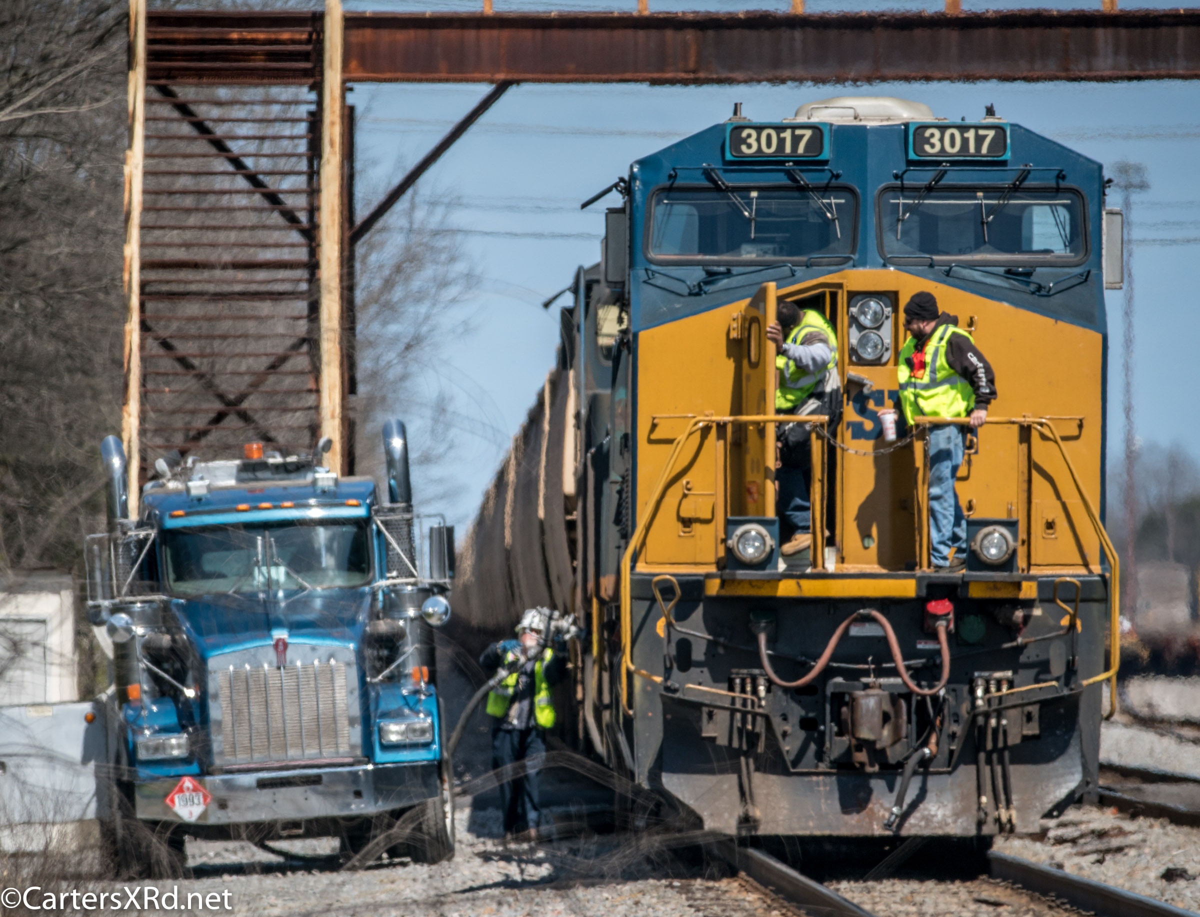 ROCKY MOUNT, NC —Took Mom to Rocky Mount last Thursday to catch her ride home with my sister. Of course I went by the CSX Yard before heading home. Caught this southbound grain train when it stopped to change crews and get the tanks topped off. You can see the pedestrian overpass in the background.