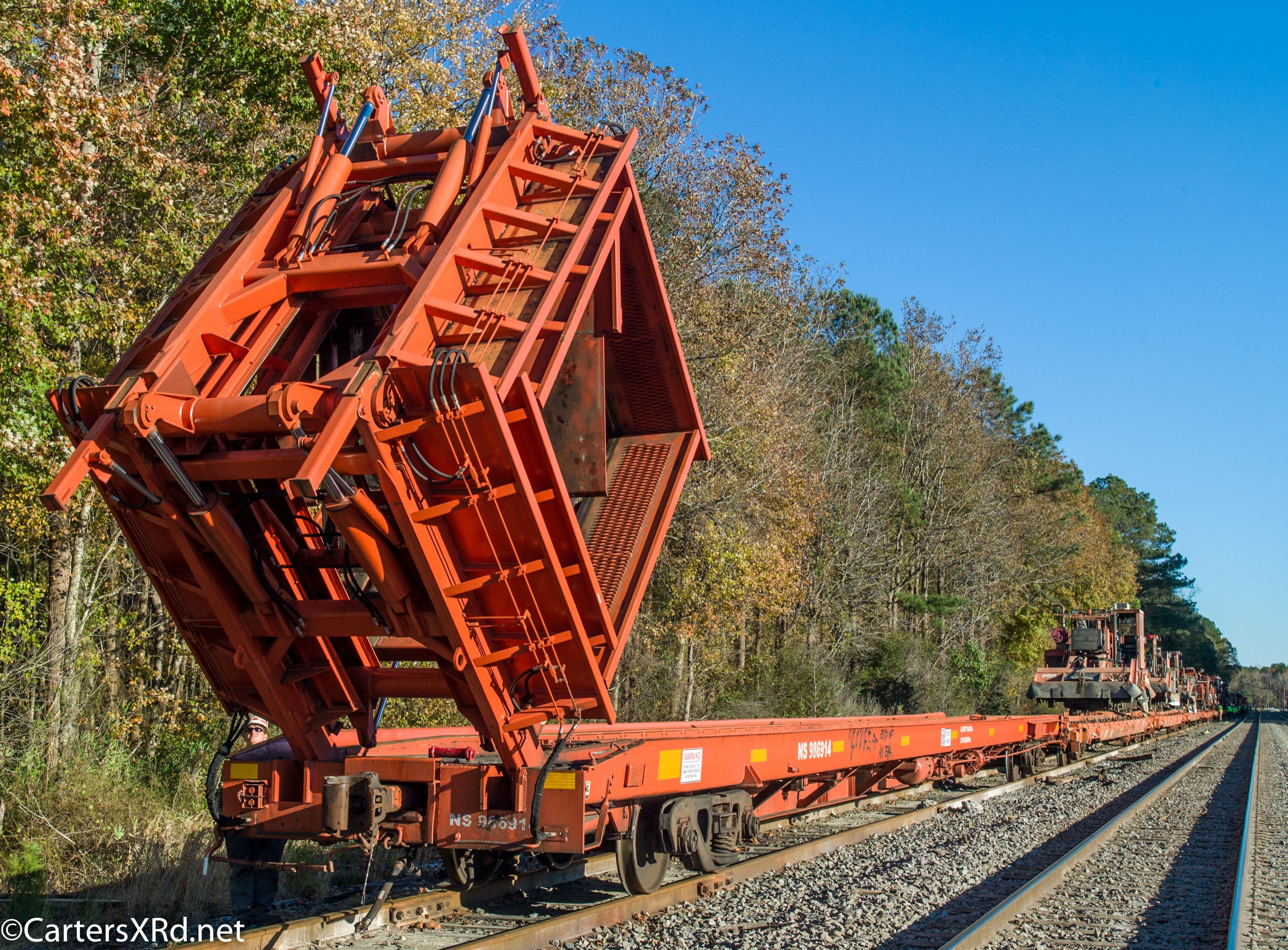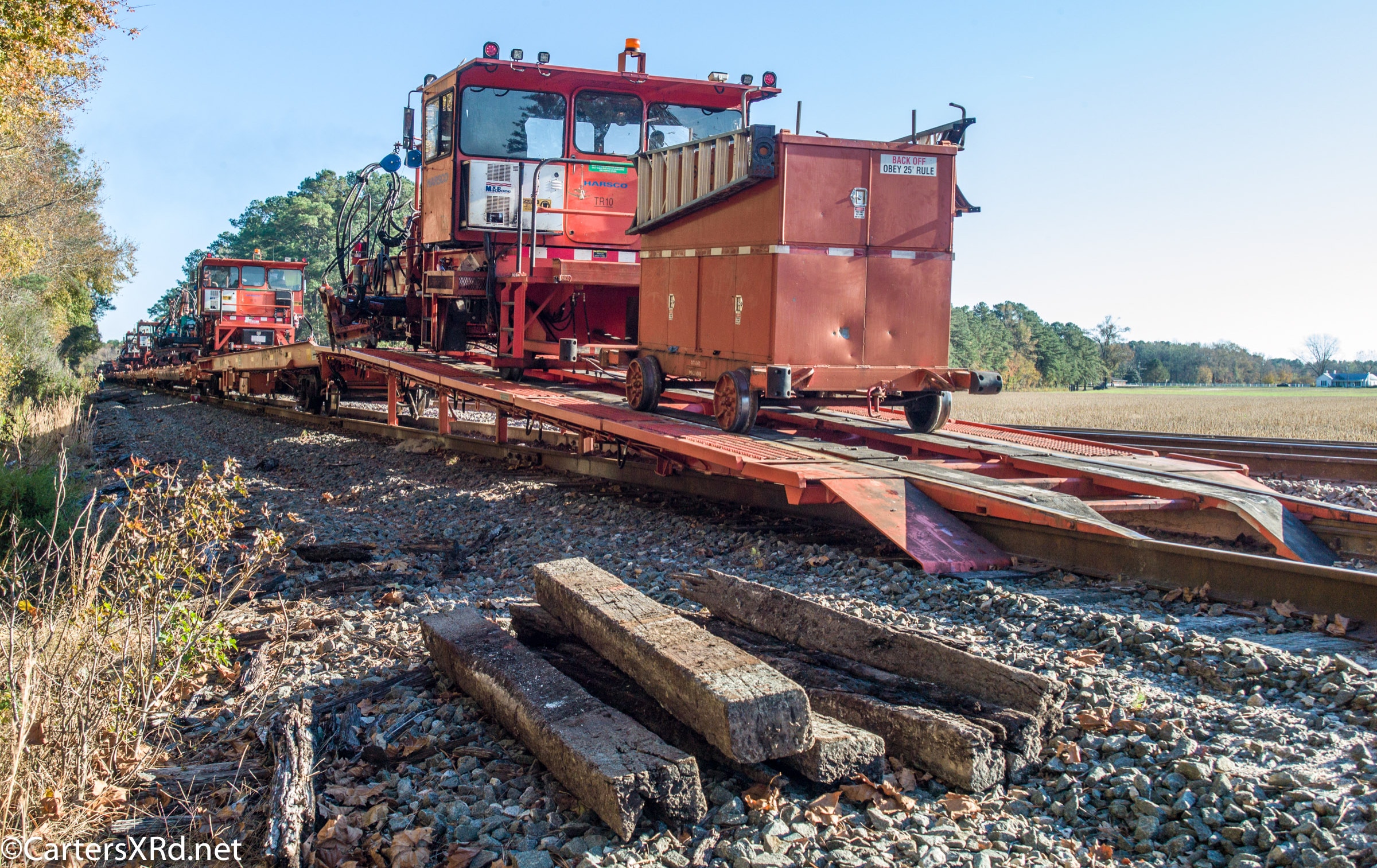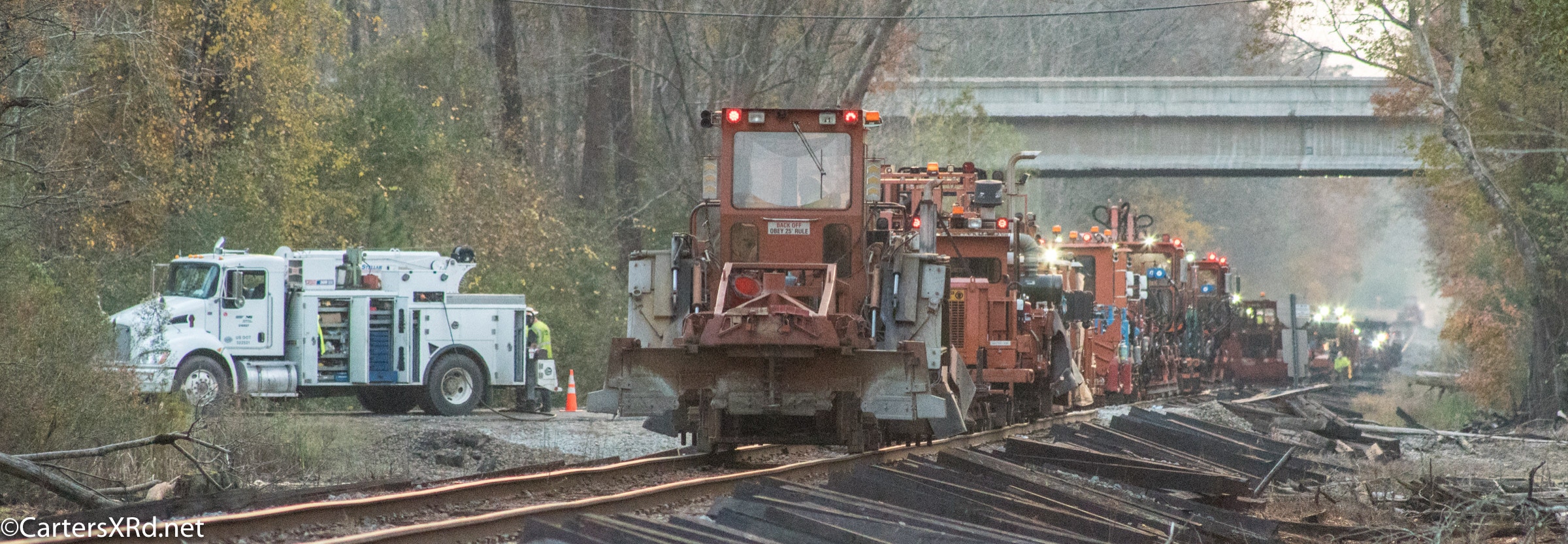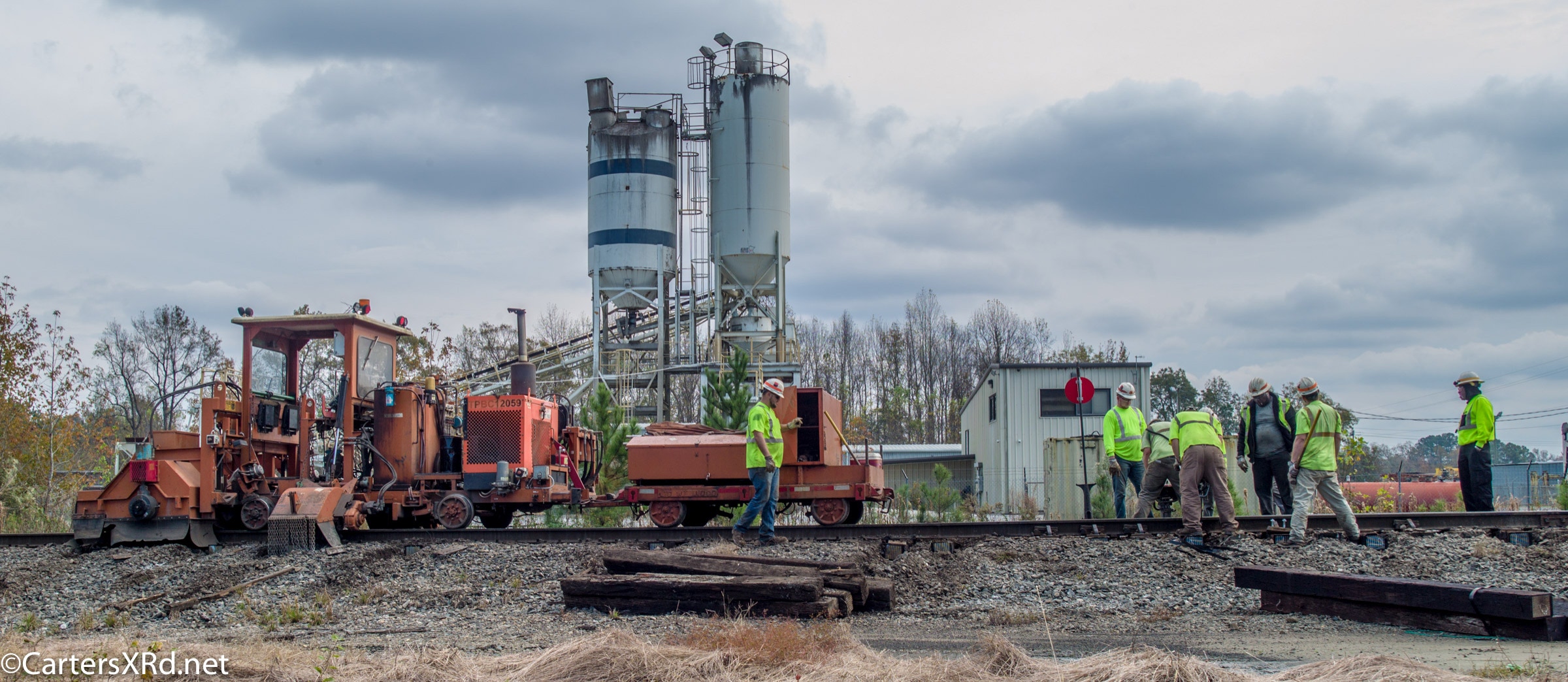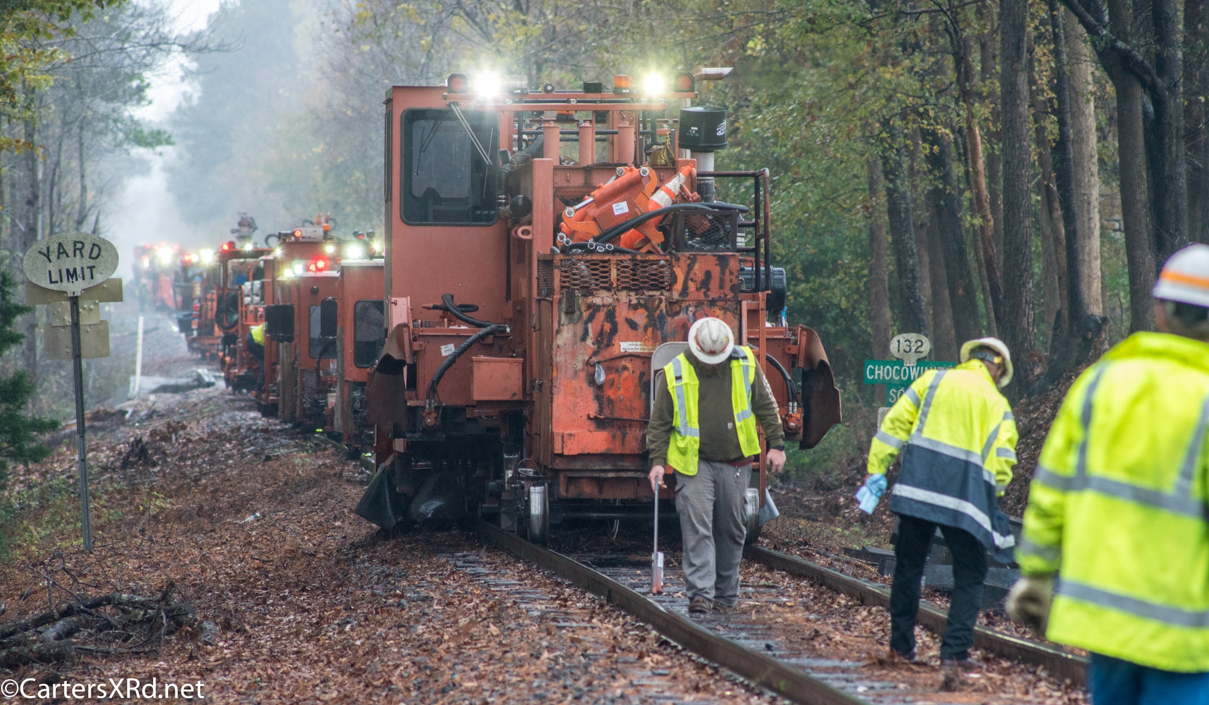 CHOCOWINITY NC — On Saturday November 17, Norfolk Southern’s traveling track crew equipment arrived in town. The train was broken down and distributed around the yard to be ready for Monday’s crew arrival. Monday morning, the crew of nearly 70 men hit the ground, unloaded their train, and cranked up dozens of machines which specialized in some small job that contributed to the finished track work. Each contraption seemed the work of a builder from some unknown place on the scale of madness to genius. This was the week of Thanksgiving, so work had to be finished in three days and the train reloaded if the team was to spend the holiday with their families. They made it. This is condensed gallery. If you are a real railroad fanatic you can find the full galleries here: Setup Weekend, Unload and Day One work, Day Two work, Day Three work and Reload.