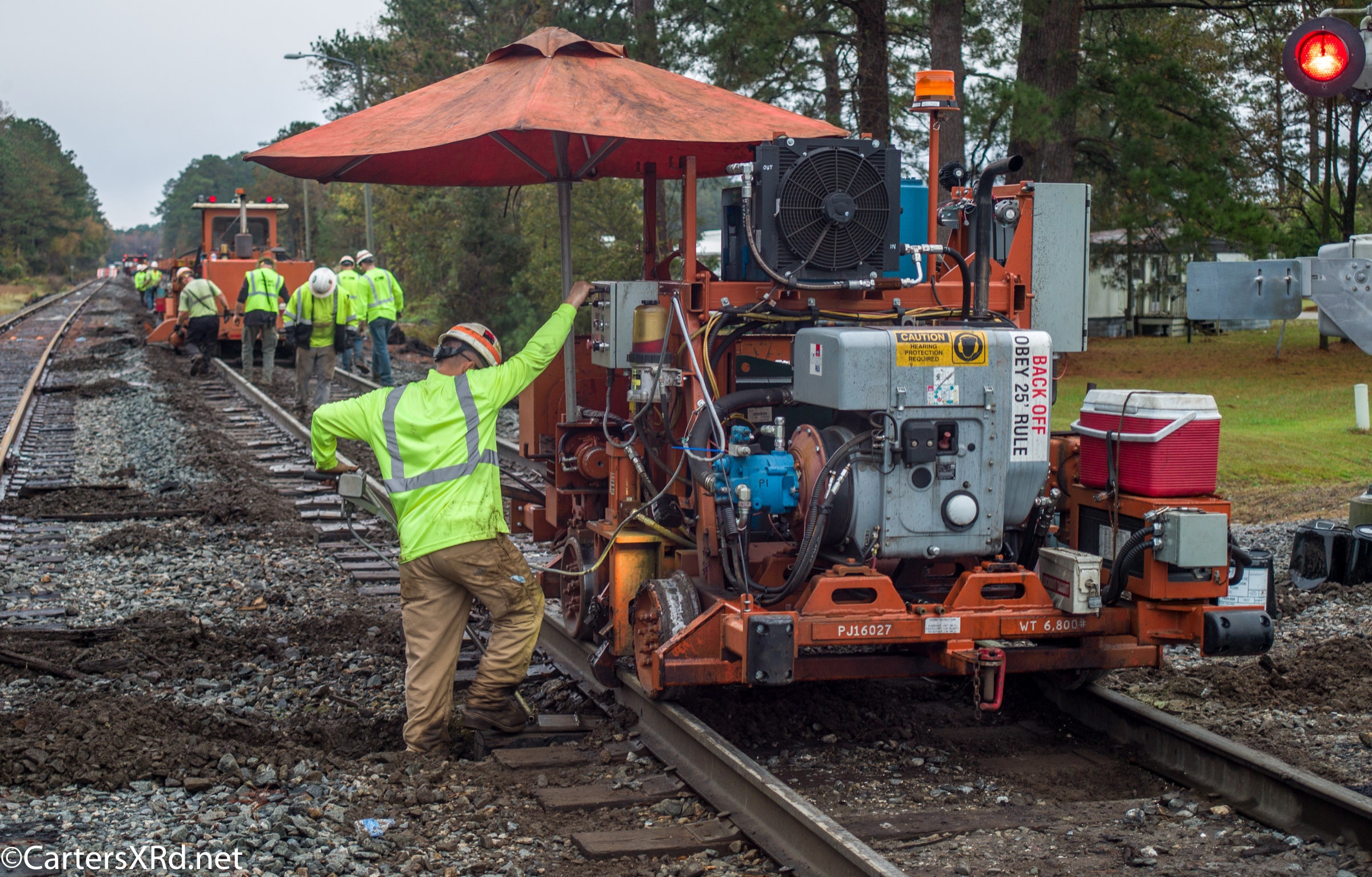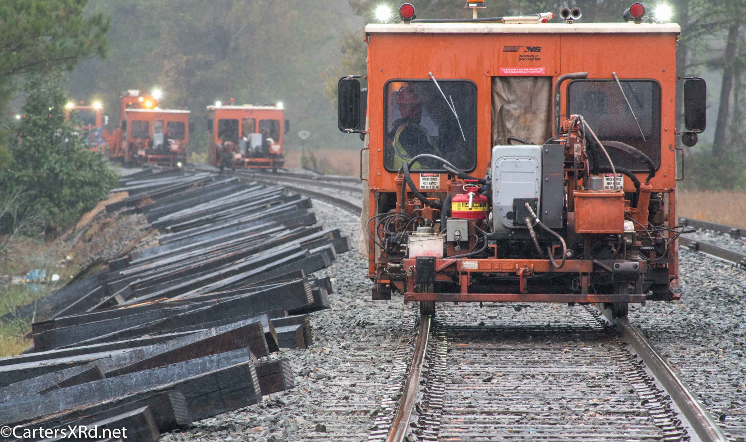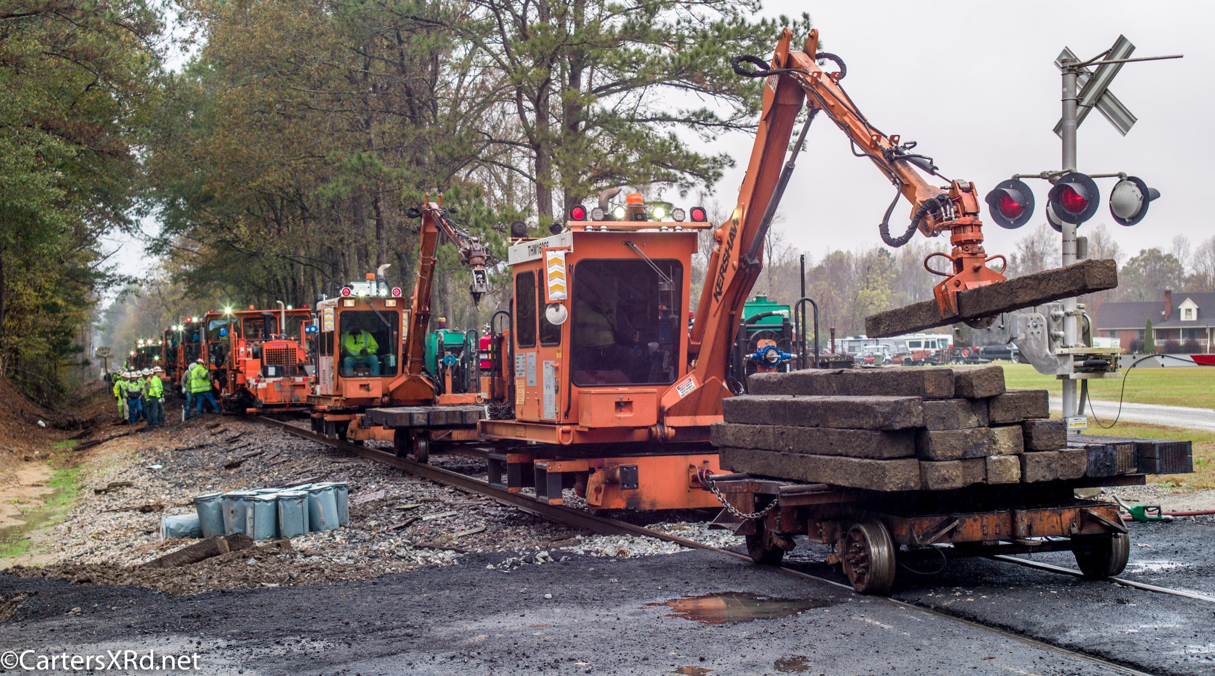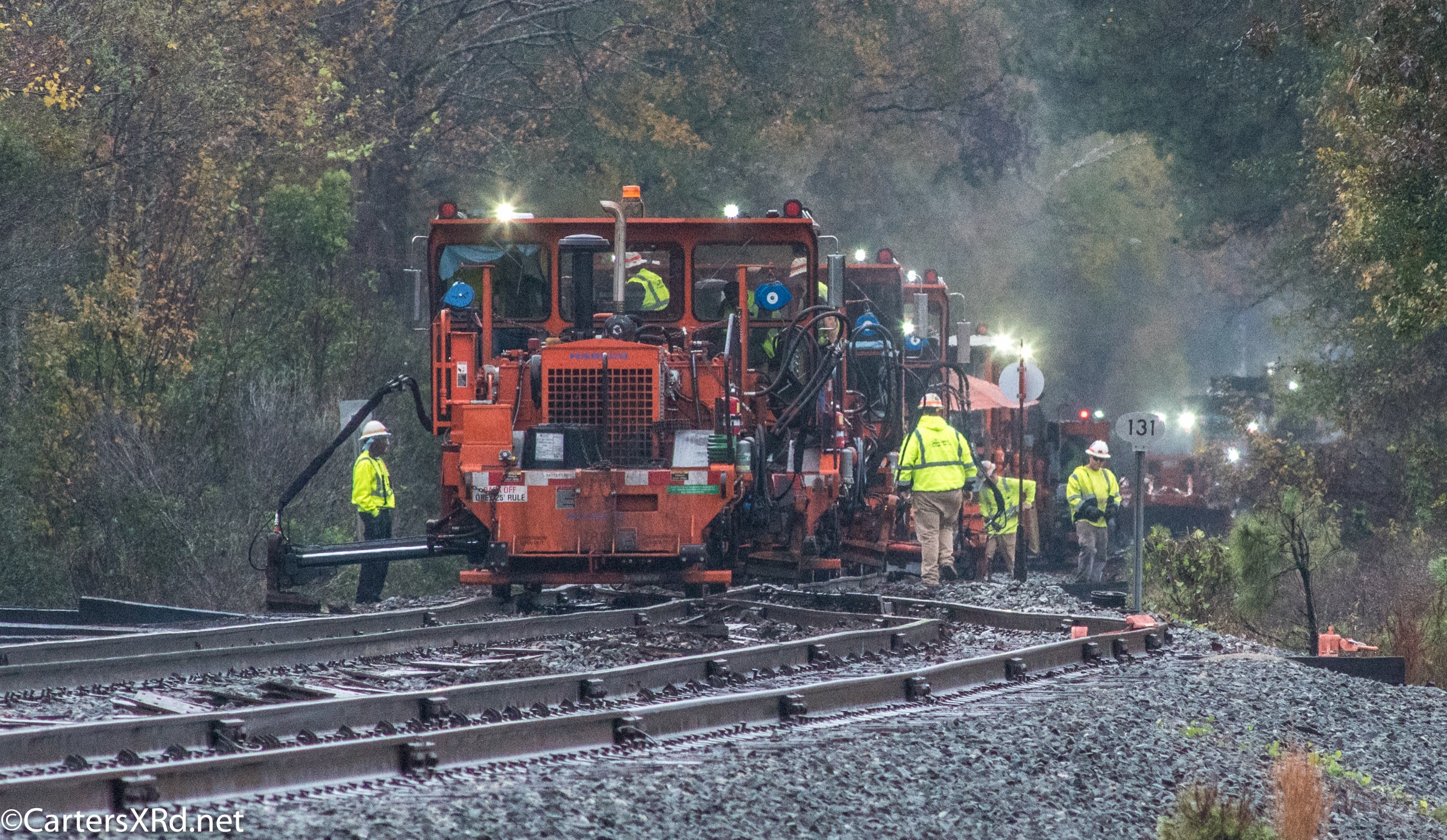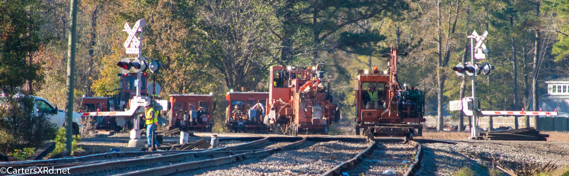 CHOCOWINITY NC — On Saturday November 17, Norfolk Southern’s traveling track crew equipment arrived in town. The train was broken down and distributed around the yard to be ready for Monday’s crew arrival. Monday morning, the crew of nearly 70 men hit the ground, unloaded their train, and cranked up dozens of machines which specialized in some small job that contributed to the finished track work. Each contraption seemed the work of a builder from some unknown place on the scale of madness to genius. This was the week of Thanksgiving, so work had to be finished in three days and the train reloaded if the team was to spend the holiday with their families. They made it. This is condensed gallery. If you are a real railroad fanatic you can find the full galleries here: Setup Weekend, Unload and Day One work, Day Two work, Day Three work and Reload.