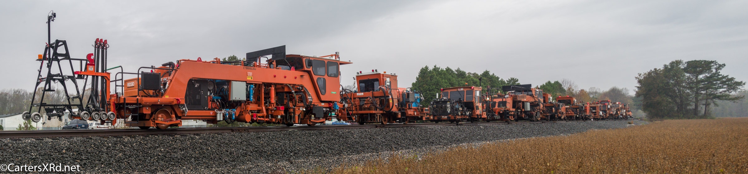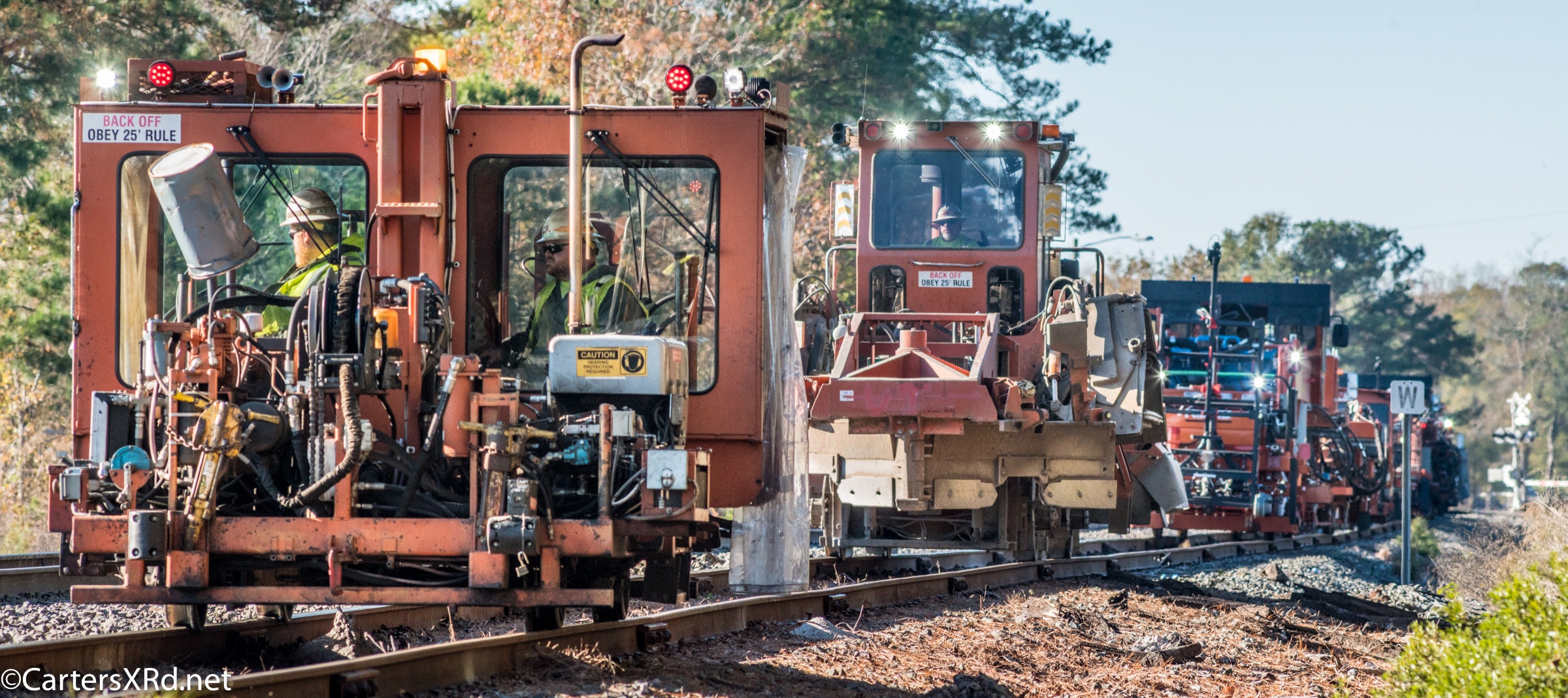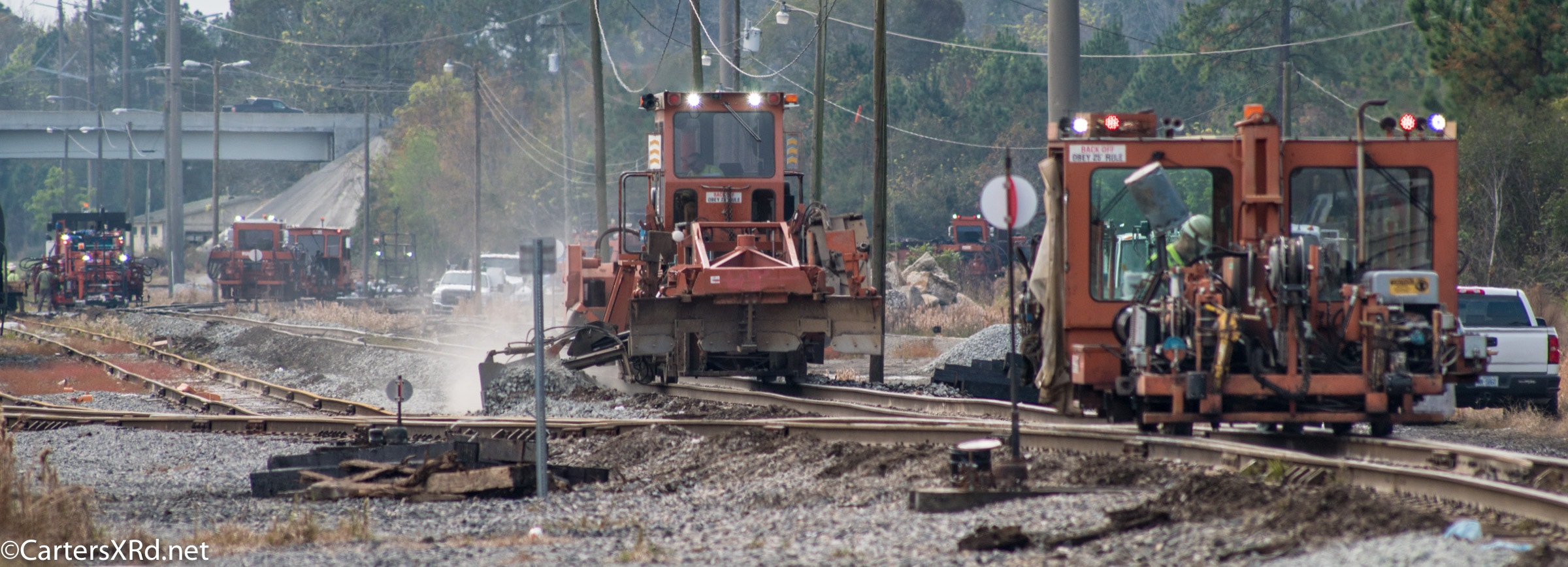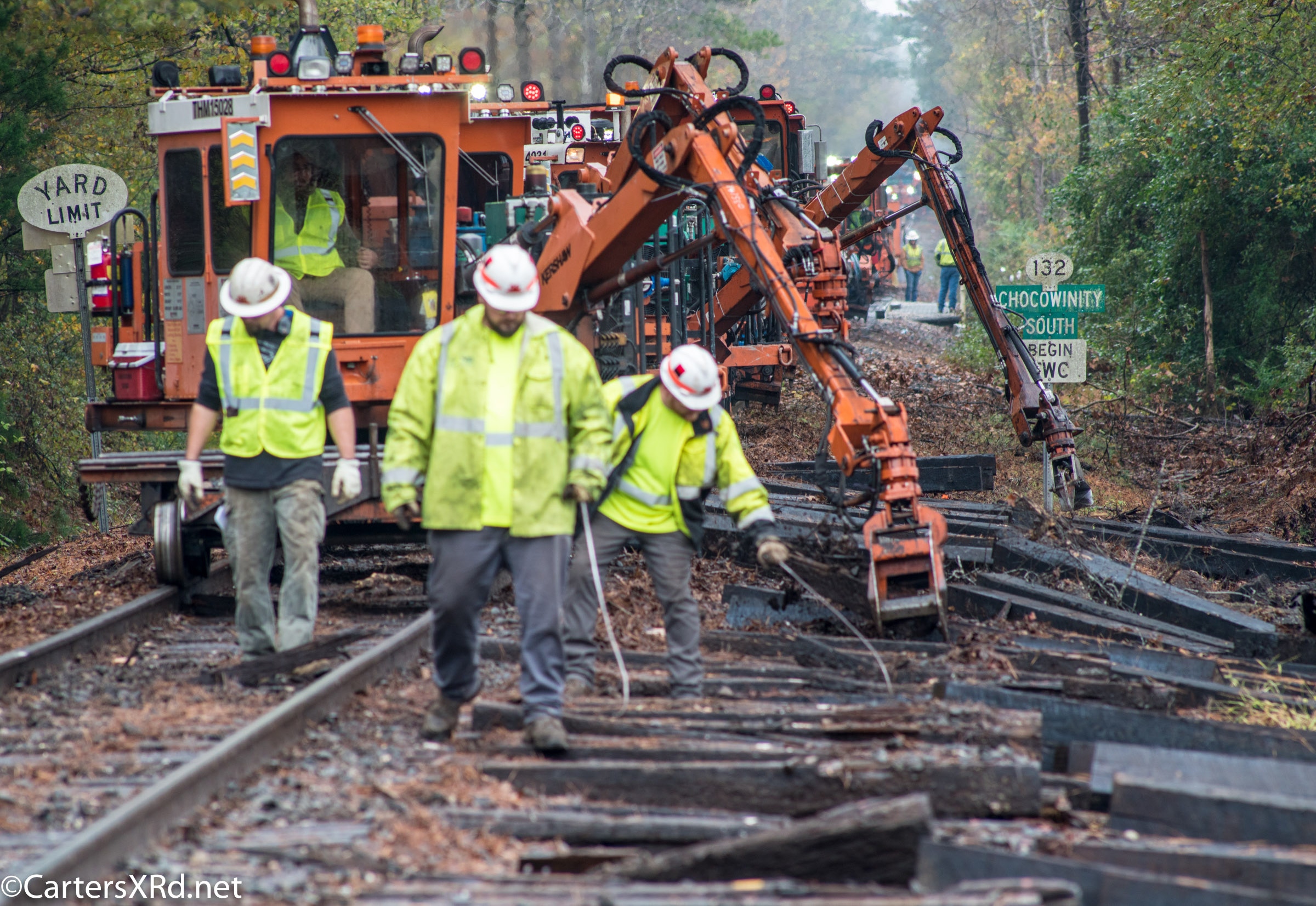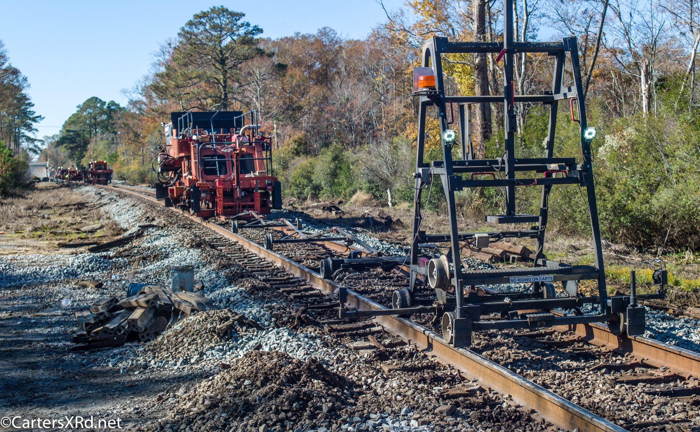 CHOCOWINITY NC — On Saturday November 17, Norfolk Southern’s traveling track crew equipment arrived in town. The train was broken down and distributed around the yard to be ready for Monday’s crew arrival. Monday morning, the crew of nearly 70 men hit the ground, unloaded their train, and cranked up dozens of machines which specialized in some small job that contributed to the finished track work. Each contraption seemed the work of a builder from some unknown place on the scale of madness to genius. This was the week of Thanksgiving, so work had to be finished in three days and the train reloaded if the team was to spend the holiday with their families. They made it. This is condensed gallery. If you are a real railroad fanatic you can find the full galleries here: Setup Weekend, Unload and Day One work, Day Two work, Day Three work and Reload.