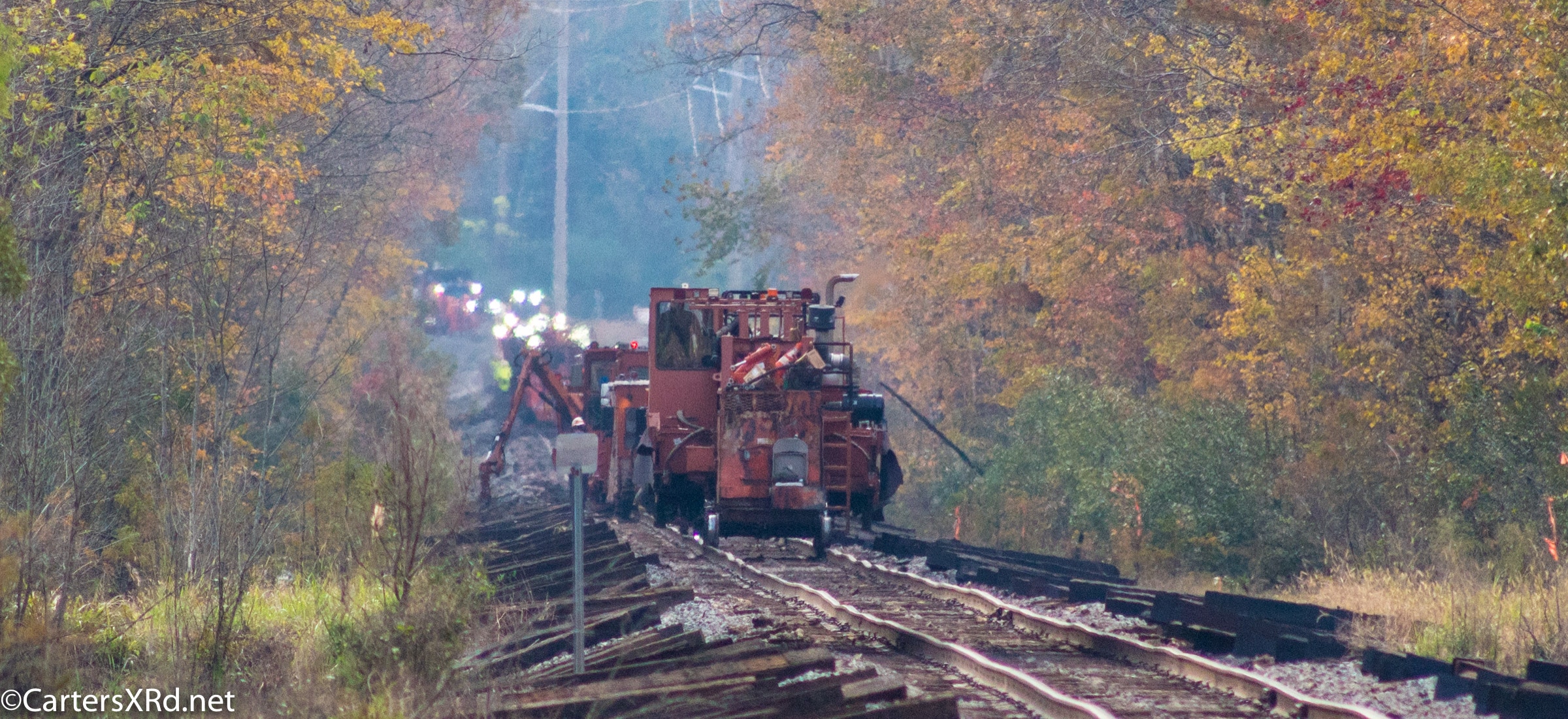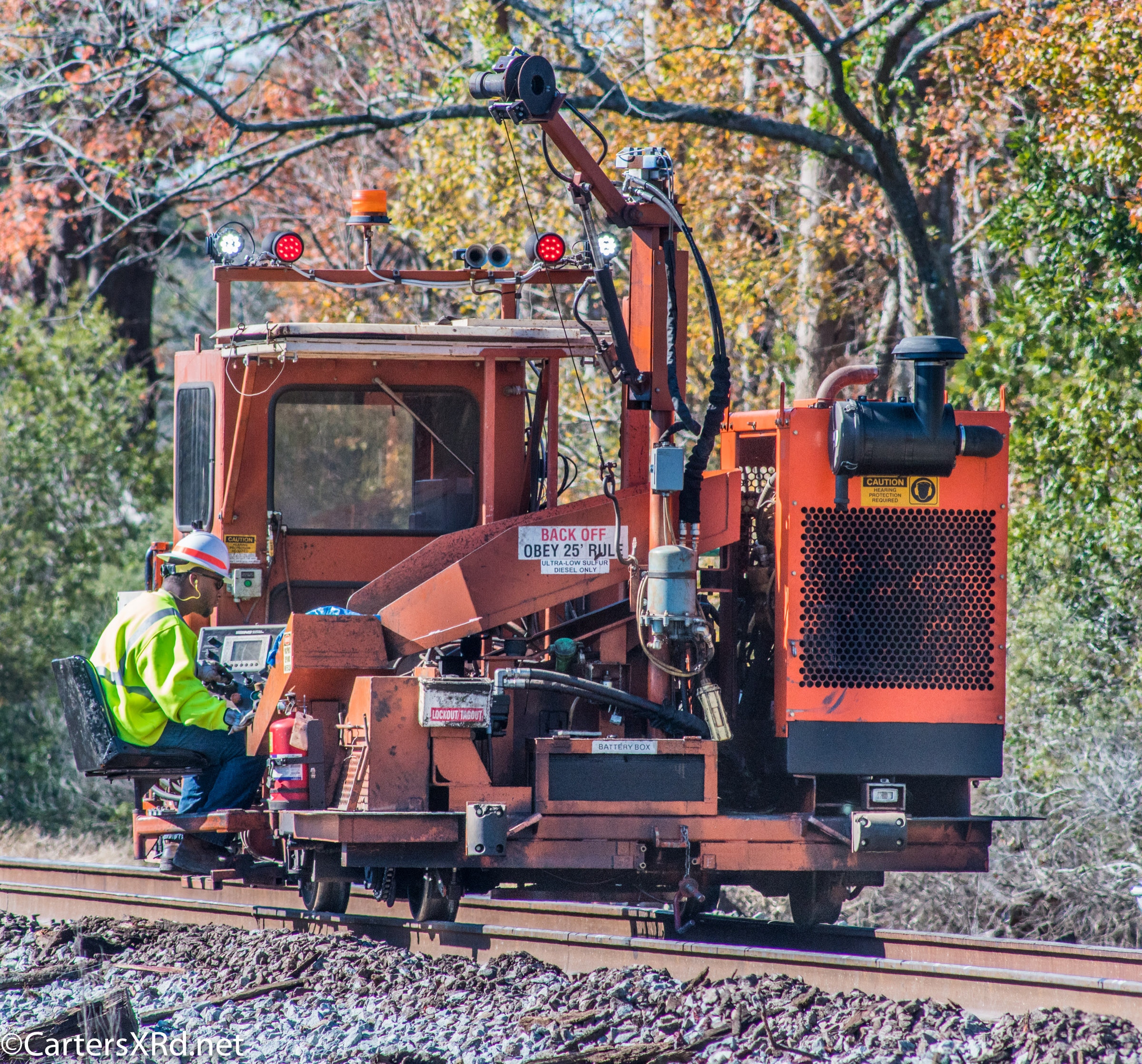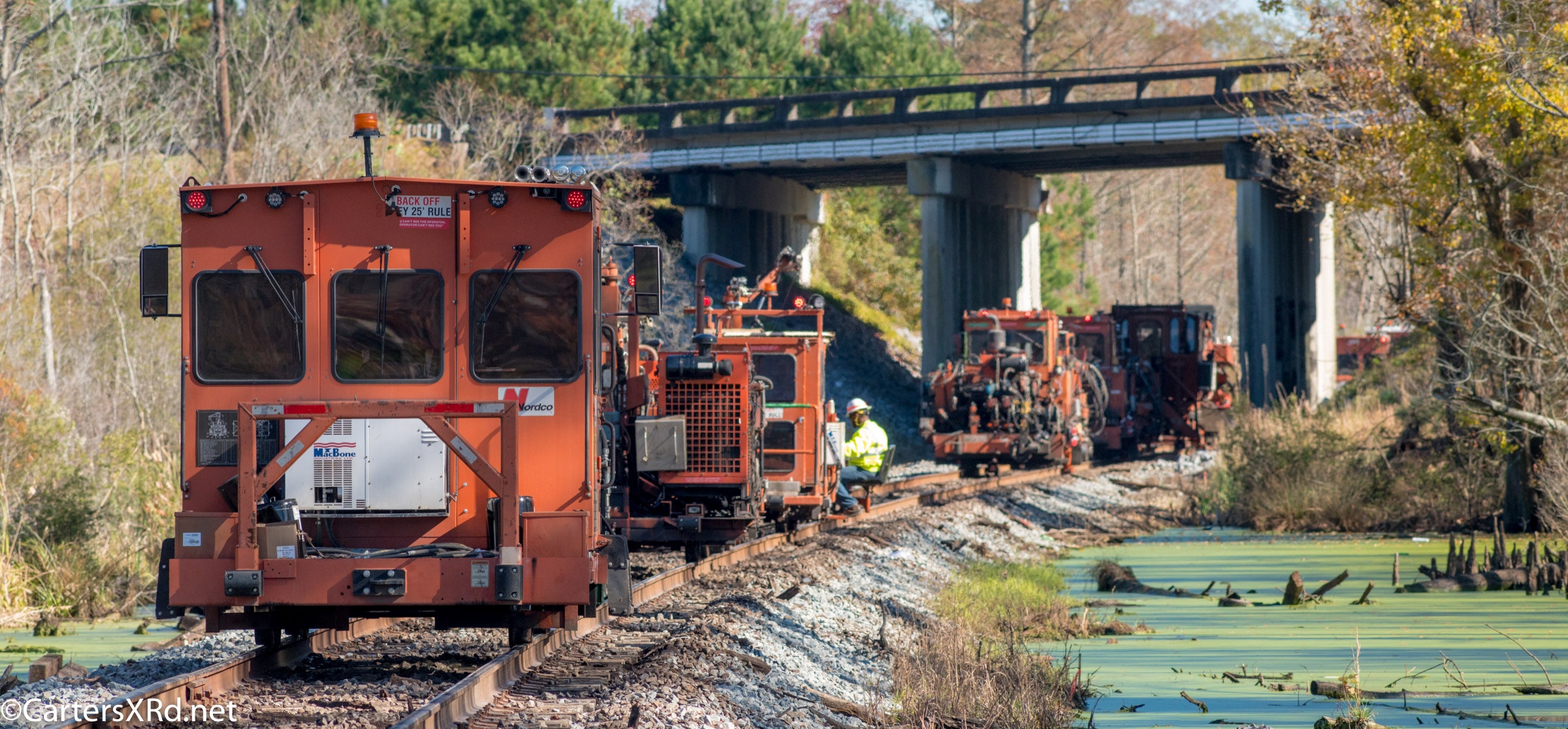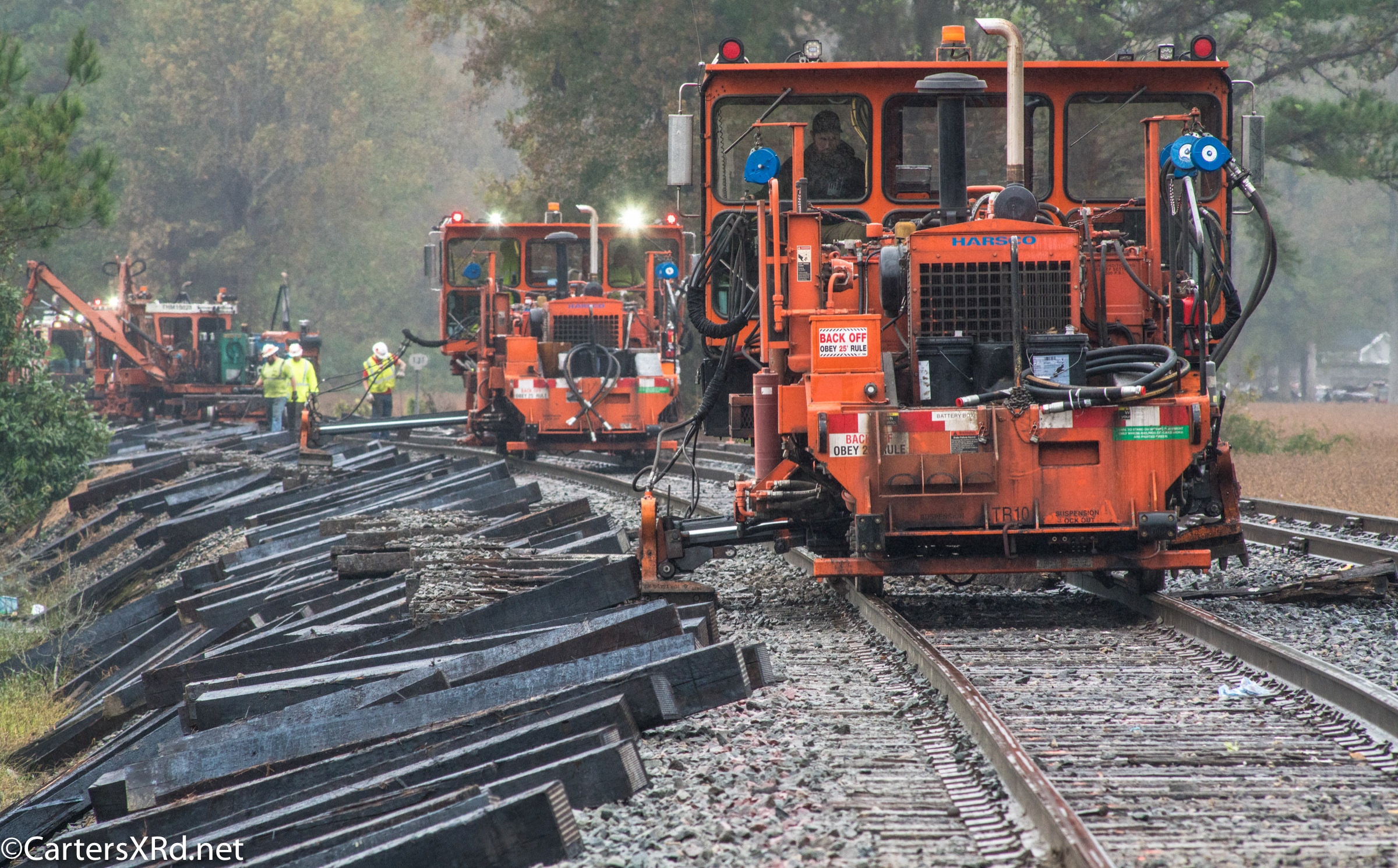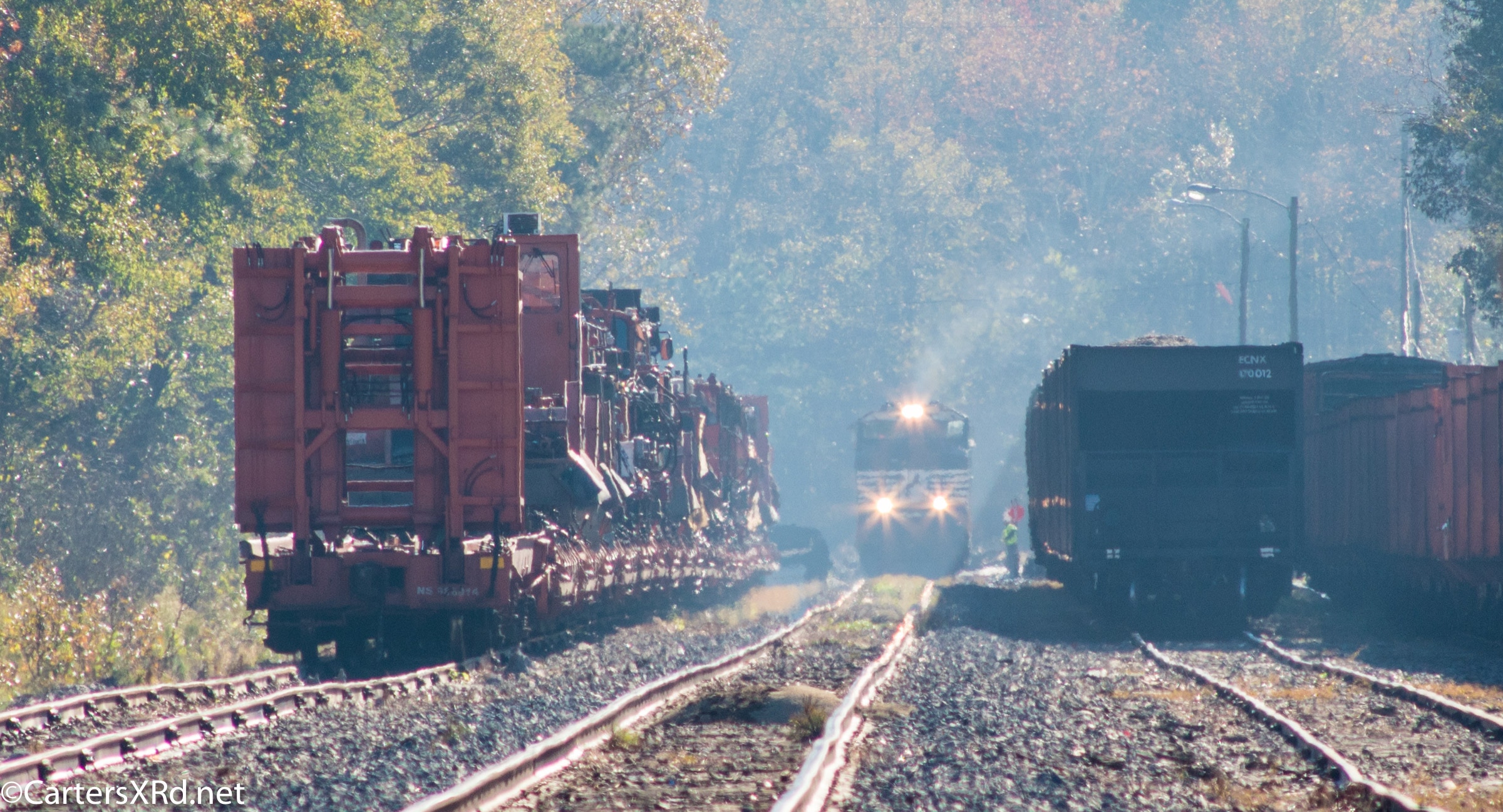 CHOCOWINITY NC — On Saturday November 17, Norfolk Southern’s traveling track crew equipment arrived in town. The train was broken down and distributed around the yard to be ready for Monday’s crew arrival. Monday morning, the crew of nearly 70 men hit the ground, unloaded their train, and cranked up dozens of machines which specialized in some small job that contributed to the finished track work. Each contraption seemed the work of a builder from some unknown place on the scale of madness to genius. This was the week of Thanksgiving, so work had to be finished in three days and the train reloaded if the team was to spend the holiday with their families. They made it. This is condensed gallery. If you are a real railroad fanatic you can find the full galleries here: Setup Weekend, Unload and Day One work, Day Two work, Day Three work and Reload.