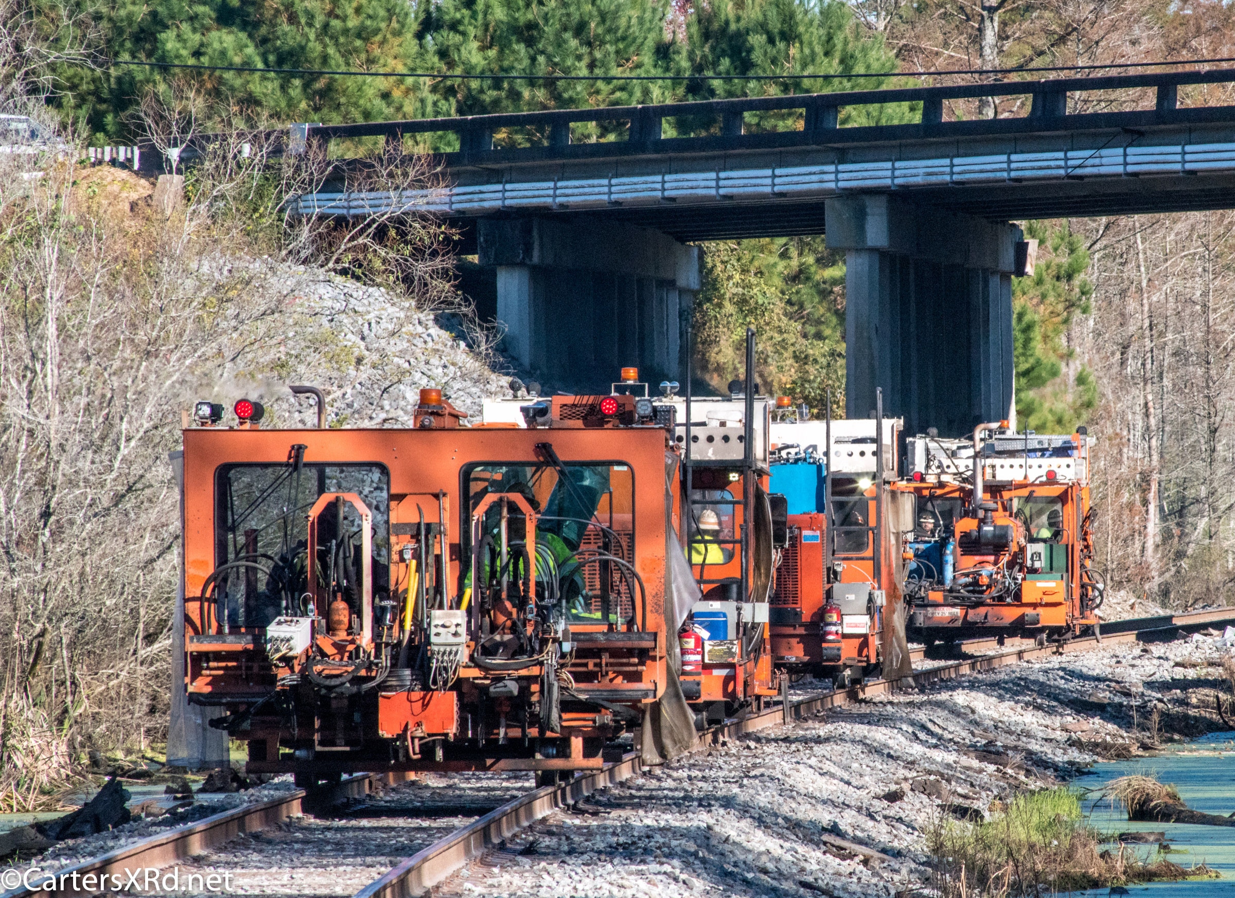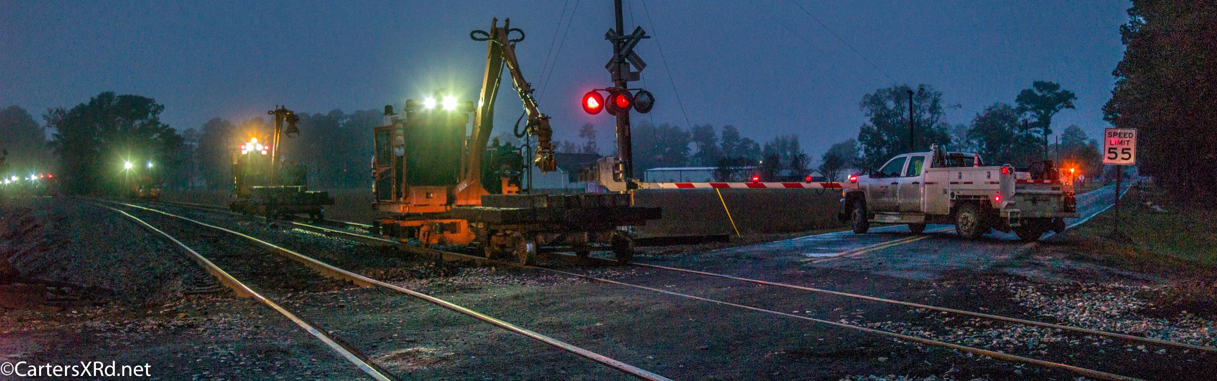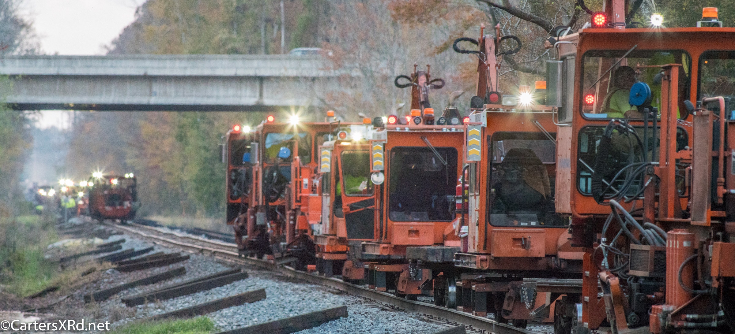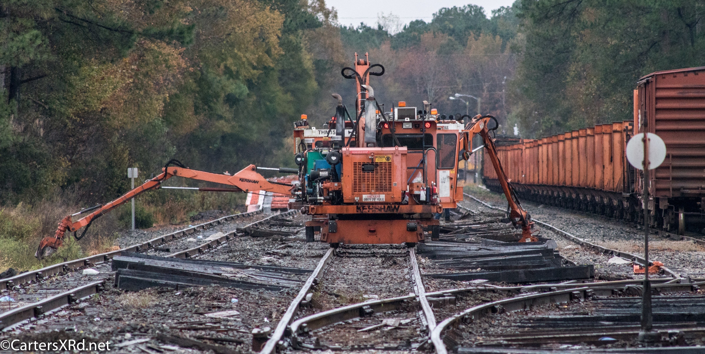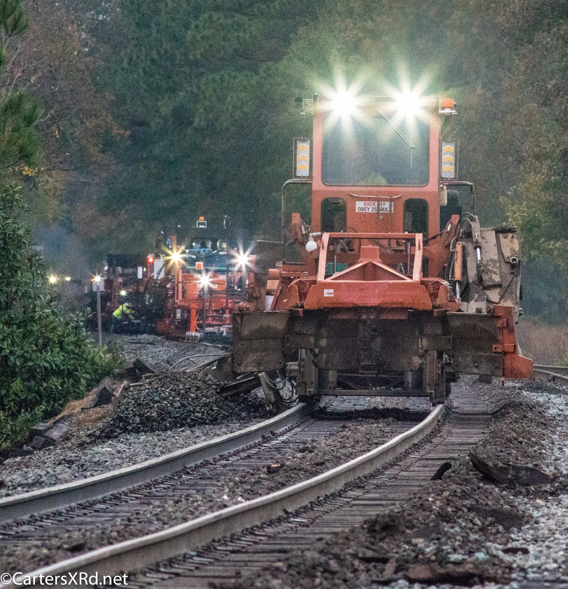 CHOCOWINITY NC — On Saturday November 17, Norfolk Southern’s traveling track crew equipment arrived in town. The train was broken down and distributed around the yard to be ready for Monday’s crew arrival. Monday morning, the crew of nearly 70 men hit the ground, unloaded their train, and cranked up dozens of machines which specialized in some small job that contributed to the finished track work. Each contraption seemed the work of a builder from some unknown place on the scale of madness to genius. This was the week of Thanksgiving, so work had to be finished in three days and the train reloaded if the team was to spend the holiday with their families. They made it. This is condensed gallery. If you are a real railroad fanatic you can find the full galleries here: Setup Weekend, Unload and Day One work, Day Two work, Day Three work and Reload.
