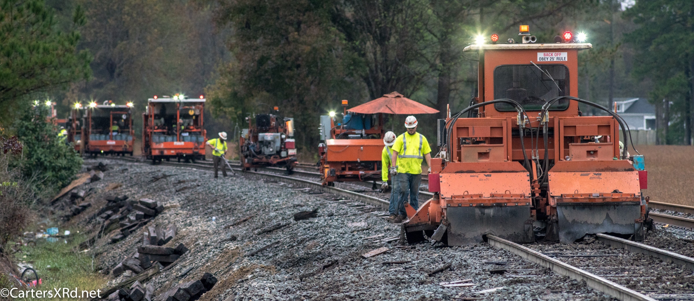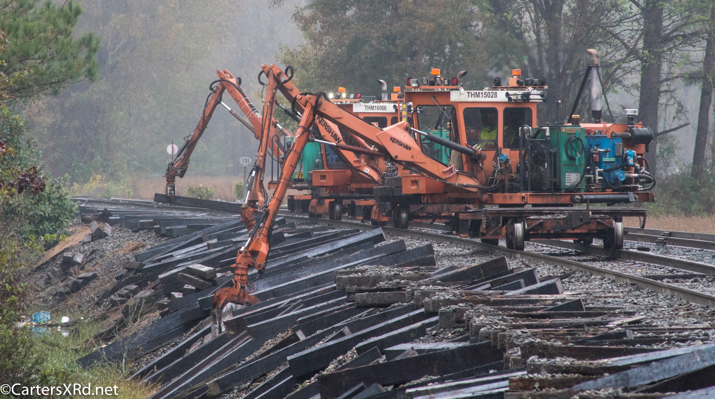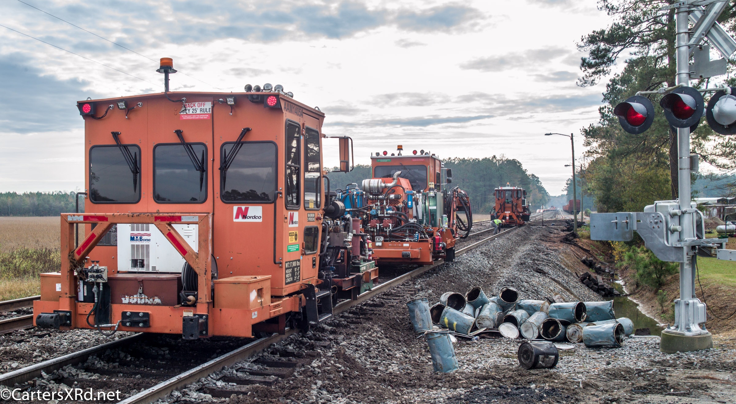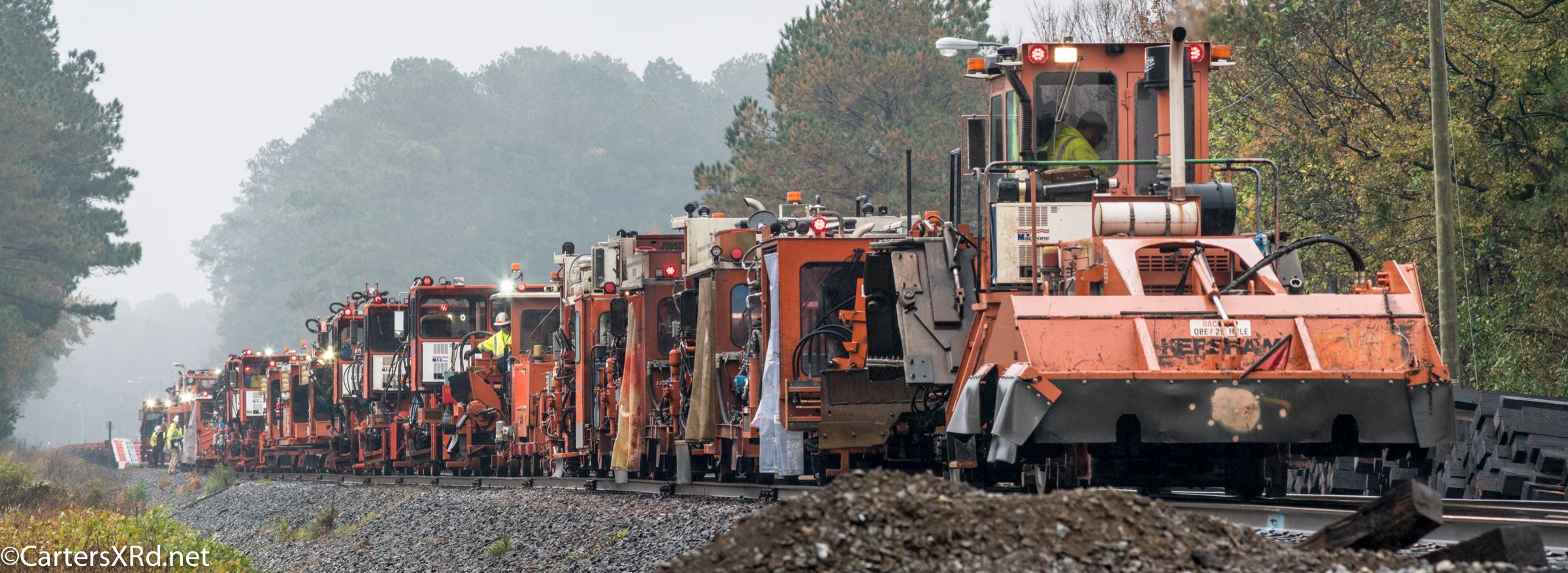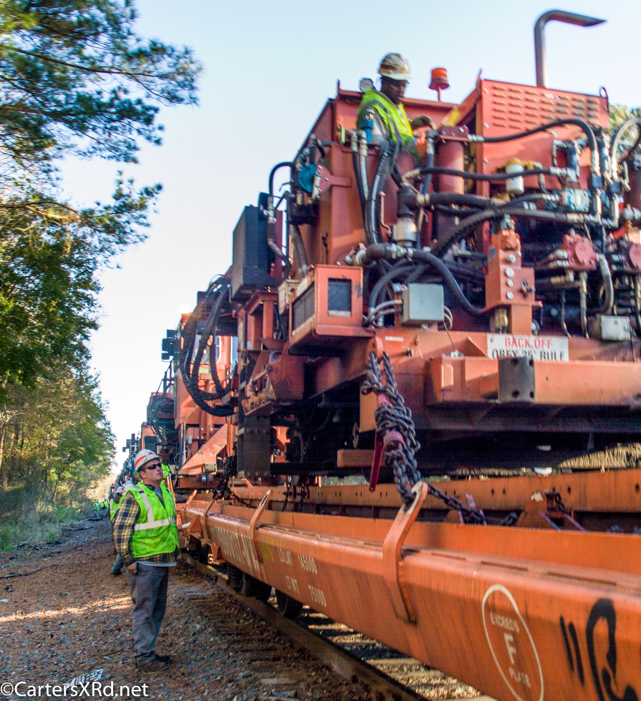 CHOCOWINITY NC — On Saturday November 17, Norfolk Southern’s traveling track crew equipment arrived in town. The train was broken down and distributed around the yard to be ready for Monday’s crew arrival. Monday morning, the crew of nearly 70 men hit the ground, unloaded their train, and cranked up dozens of machines which specialized in some small job that contributed to the finished track work. Each contraption seemed the work of a builder from some unknown place on the scale of madness to genius. This was the week of Thanksgiving, so work had to be finished in three days and the train reloaded if the team was to spend the holiday with their families. They made it. This is condensed gallery. If you are a real railroad fanatic you can find the full galleries here: Setup Weekend, Unload and Day One work, Day Two work, Day Three work and Reload.