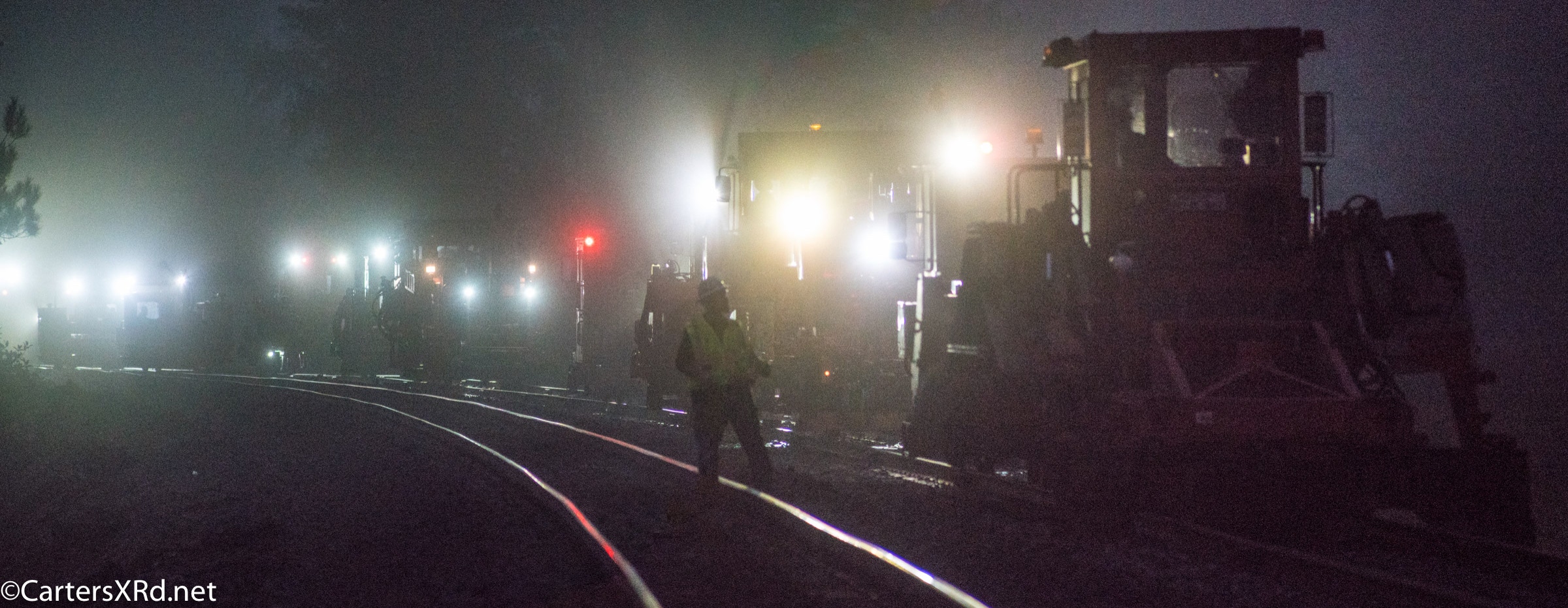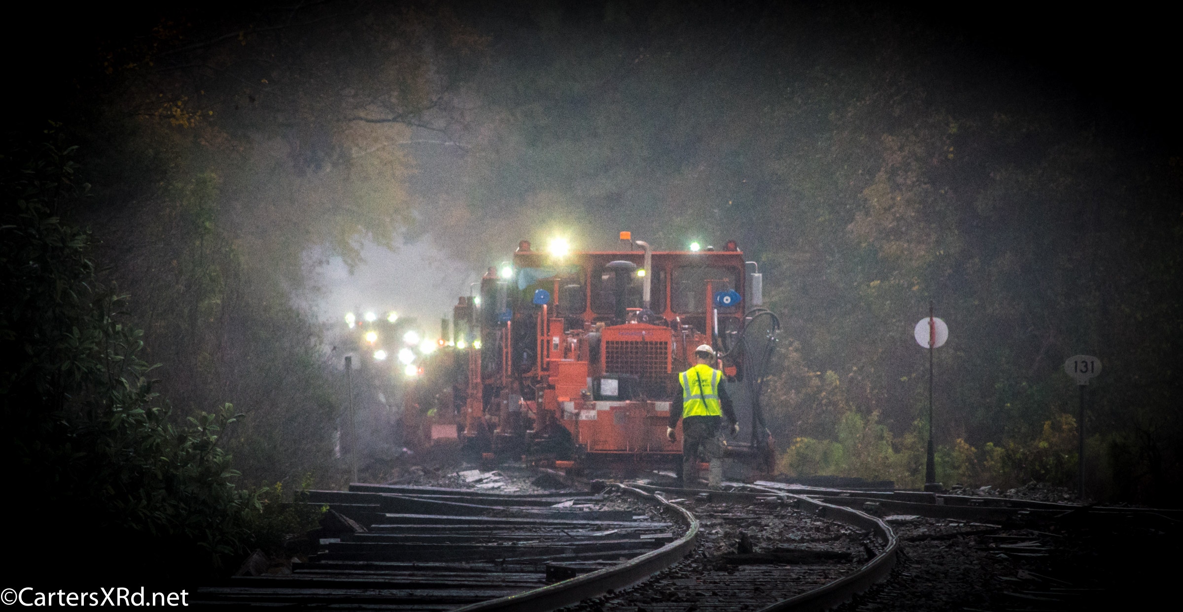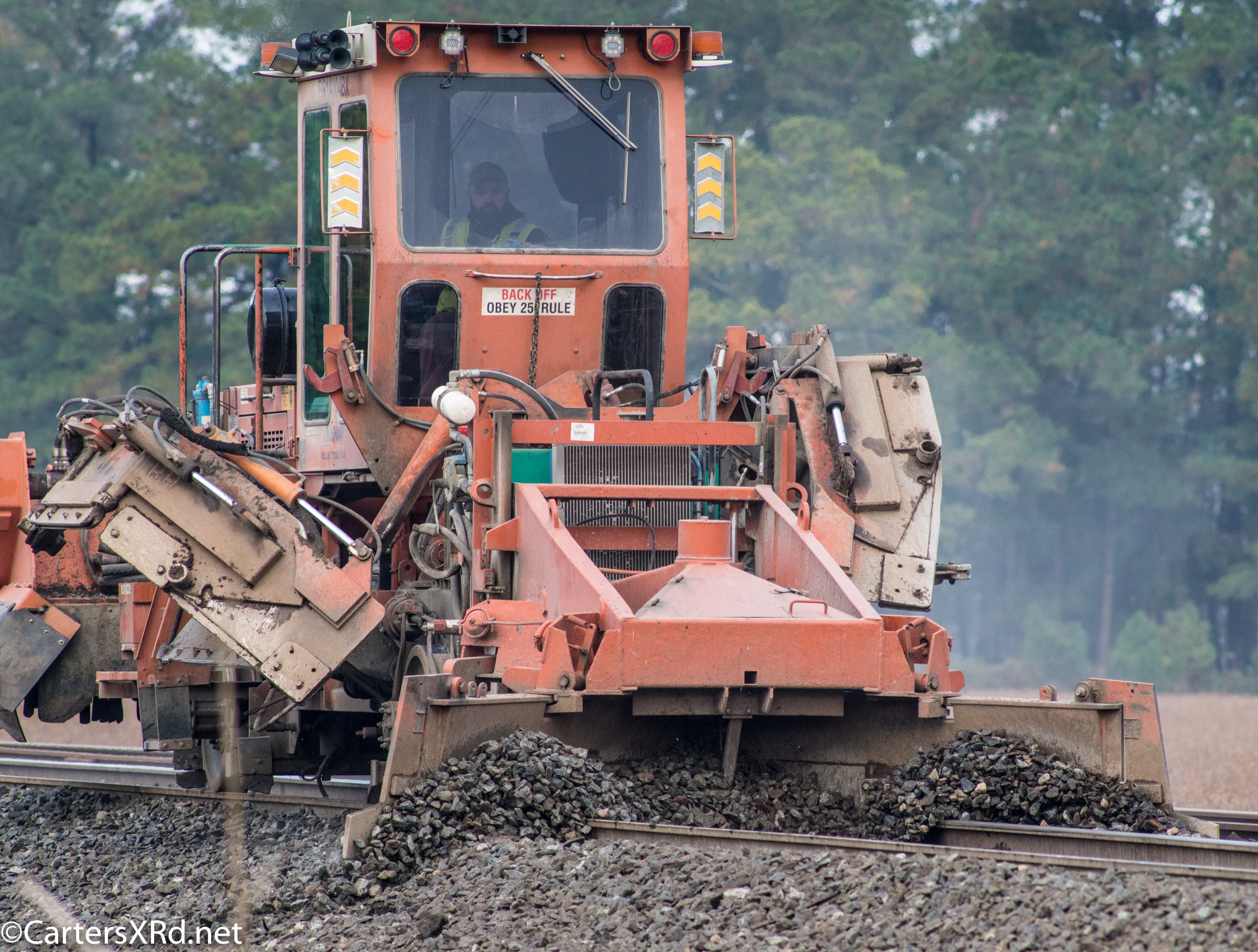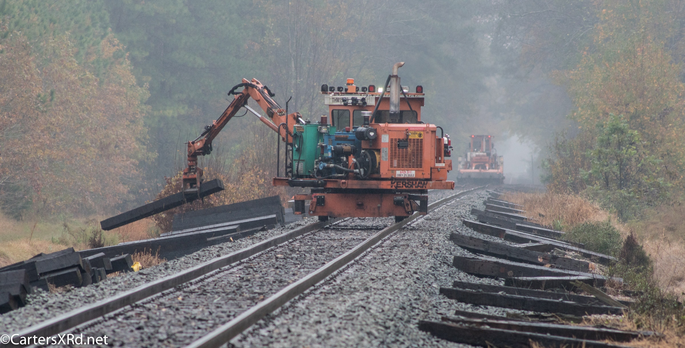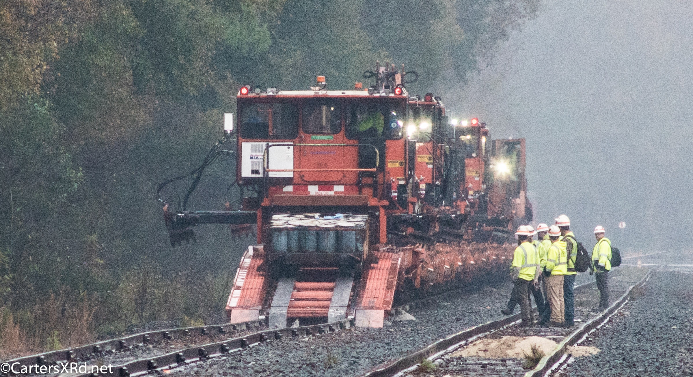 CHOCOWINITY NC — On Saturday November 17, Norfolk Southern’s traveling track crew equipment arrived in town. The train was broken down and distributed around the yard to be ready for Monday’s crew arrival. Monday morning, the crew of nearly 70 men hit the ground, unloaded their train, and cranked up dozens of machines which specialized in some small job that contributed to the finished track work. Each contraption seemed the work of a builder from some unknown place on the scale of madness to genius. This was the week of Thanksgiving, so work had to be finished in three days and the train reloaded if the team was to spend the holiday with their families. They made it. This is condensed gallery. If you are a real railroad fanatic you can find the full galleries here: Setup Weekend, Unload and Day One work, Day Two work, Day Three work and Reload.
