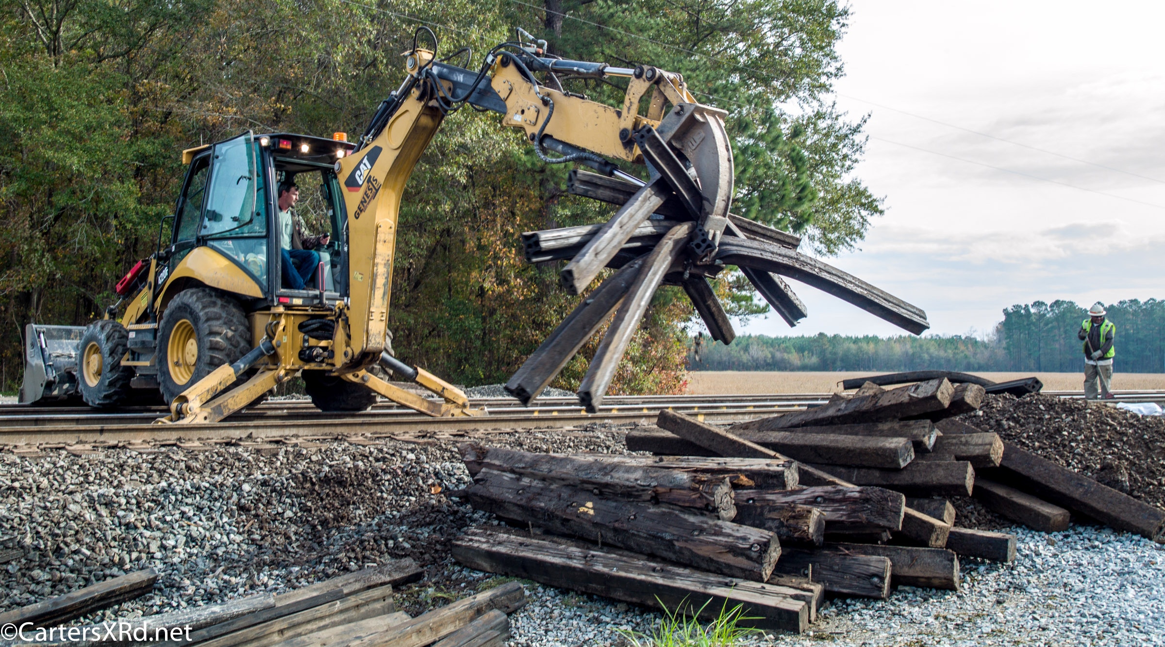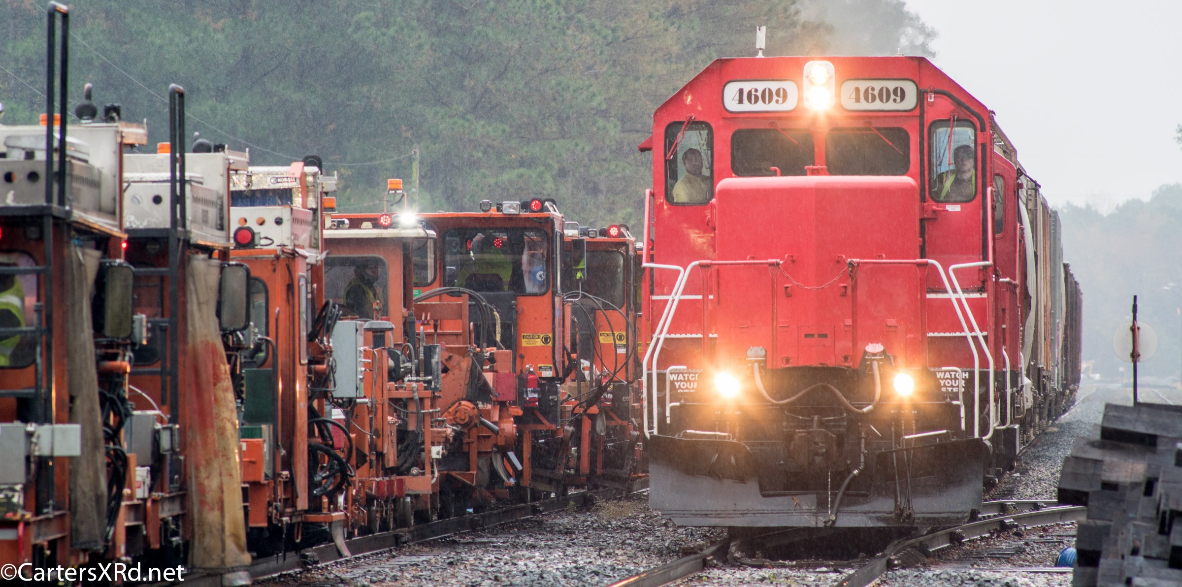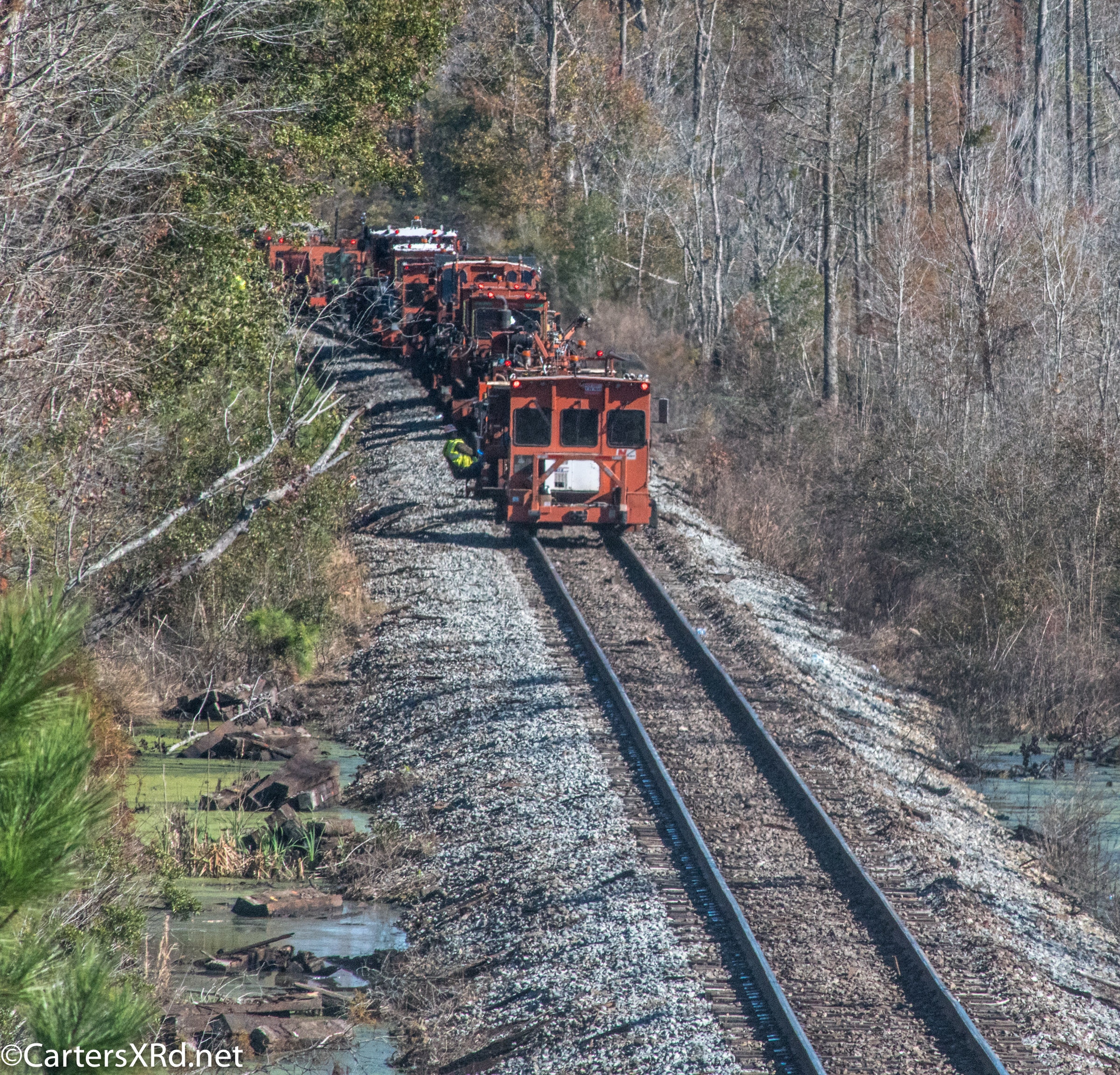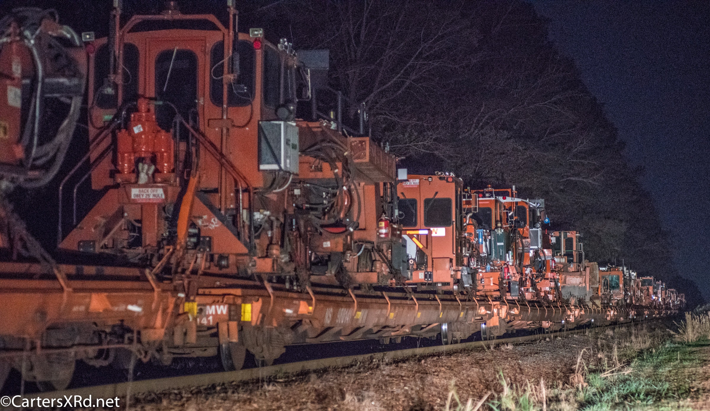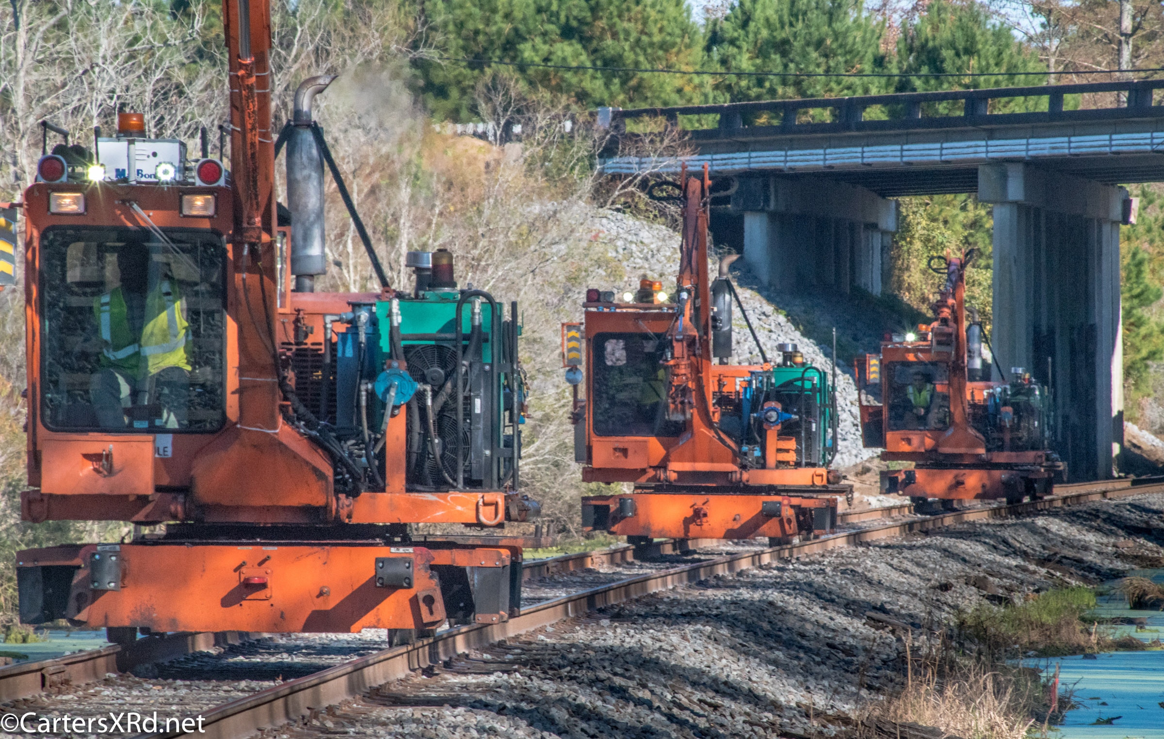 CHOCOWINITY NC — On Saturday November 17, Norfolk Southern’s traveling track crew equipment arrived in town. The train was broken down and distributed around the yard to be ready for Monday’s crew arrival. Monday morning, the crew of nearly 70 men hit the ground, unloaded their train, and cranked up dozens of machines which specialized in some small job that contributed to the finished track work. Each contraption seemed the work of a builder from some unknown place on the scale of madness to genius. This was the week of Thanksgiving, so work had to be finished in three days and the train reloaded if the team was to spend the holiday with their families. They made it. This is condensed gallery. If you are a real railroad fanatic you can find the full galleries here: Setup Weekend, Unload and Day One work, Day Two work, Day Three work and Reload.