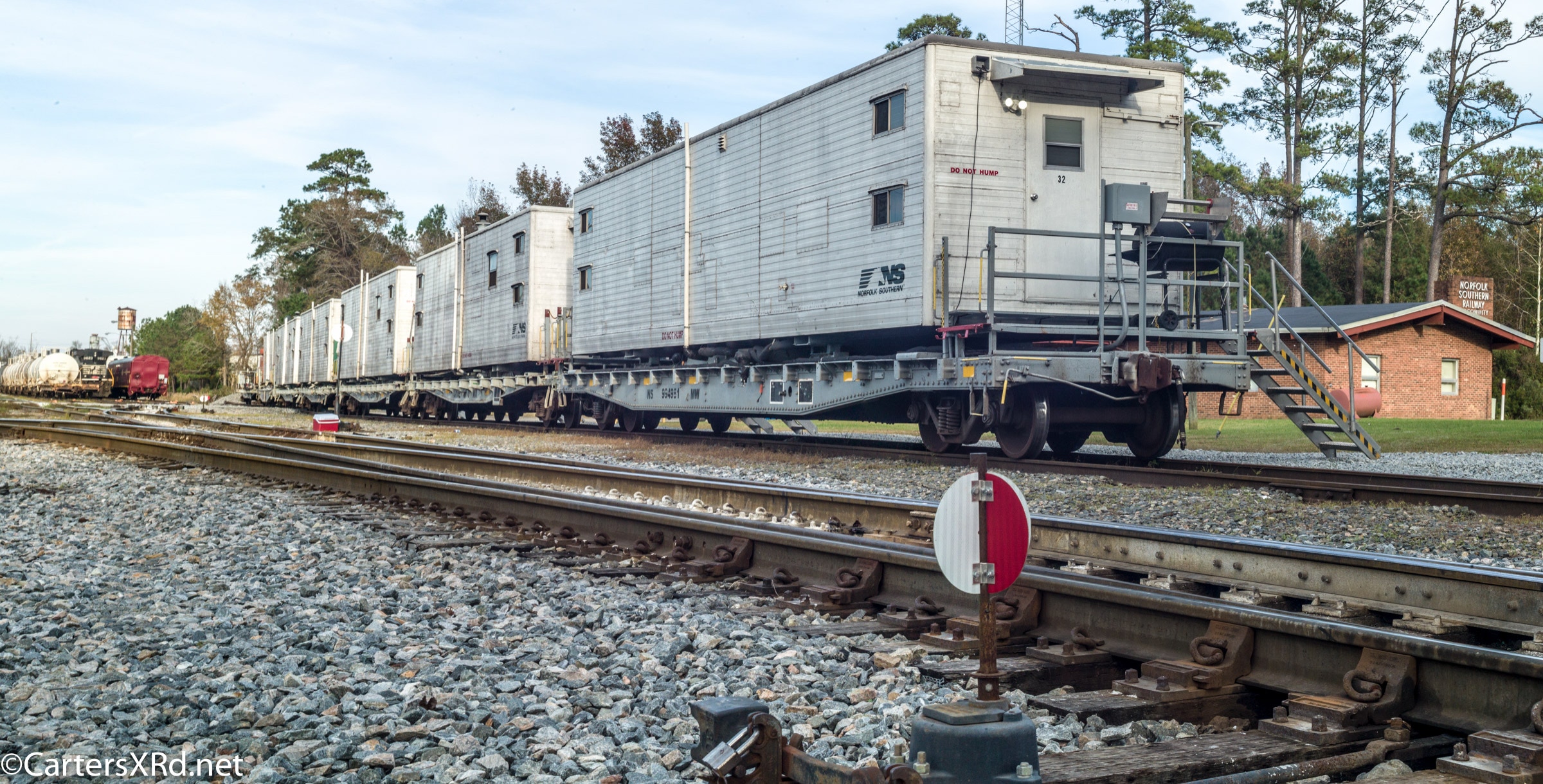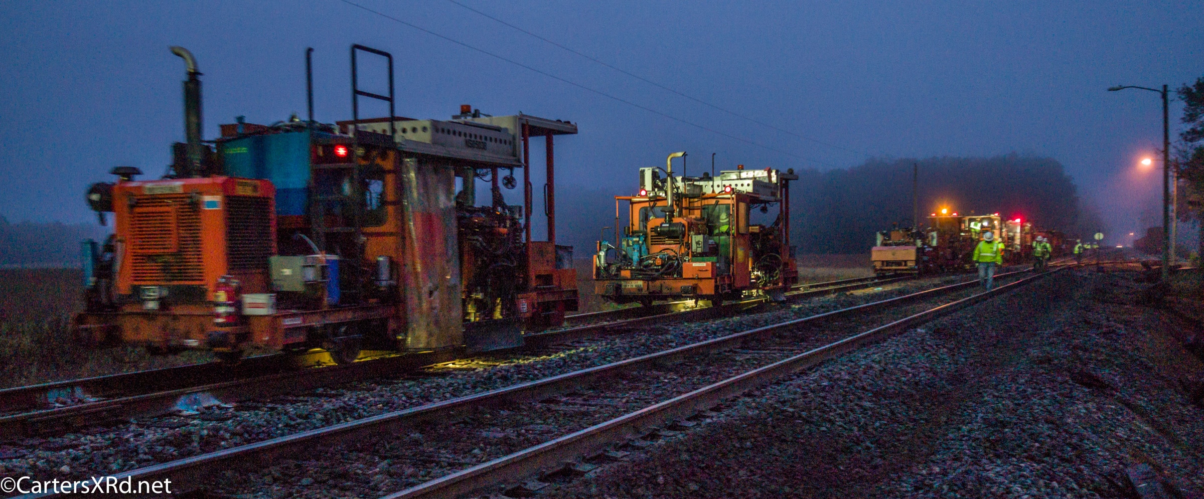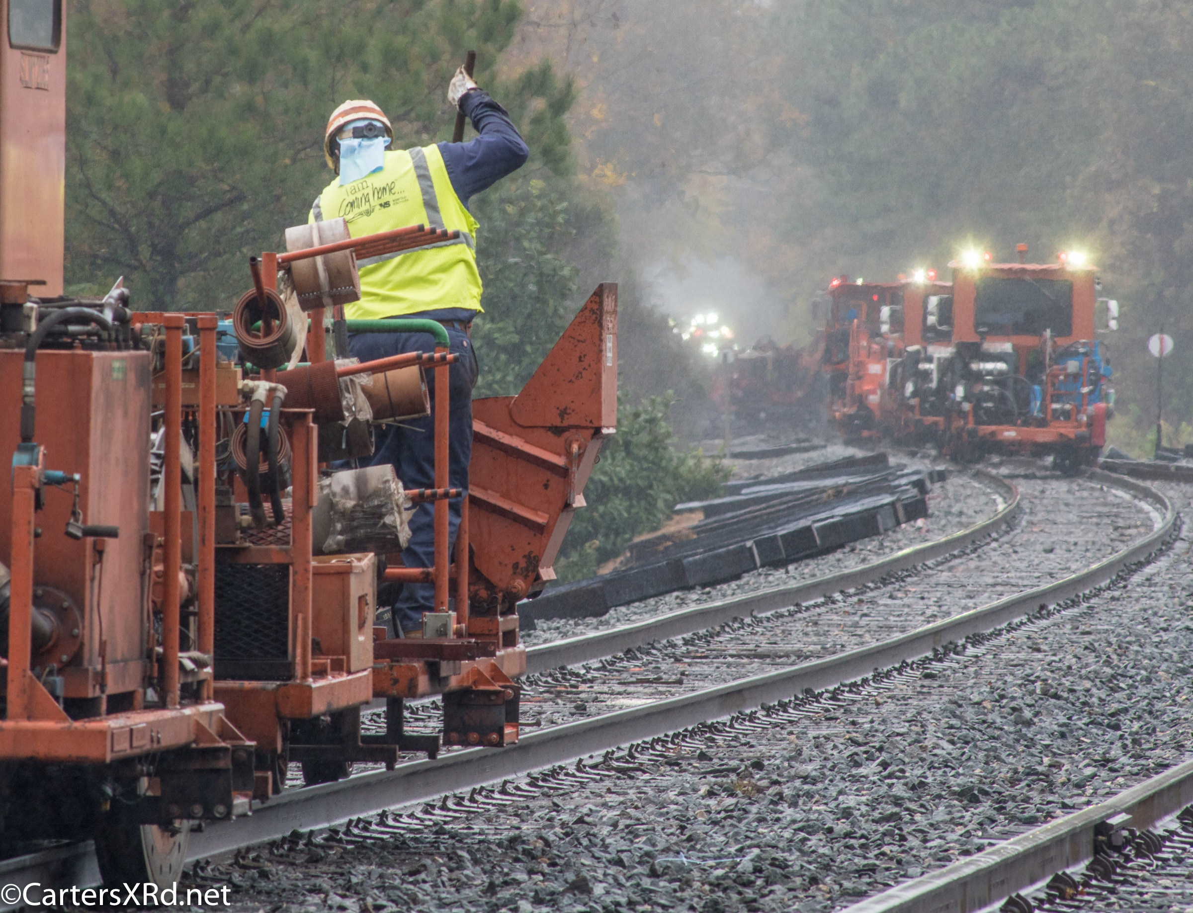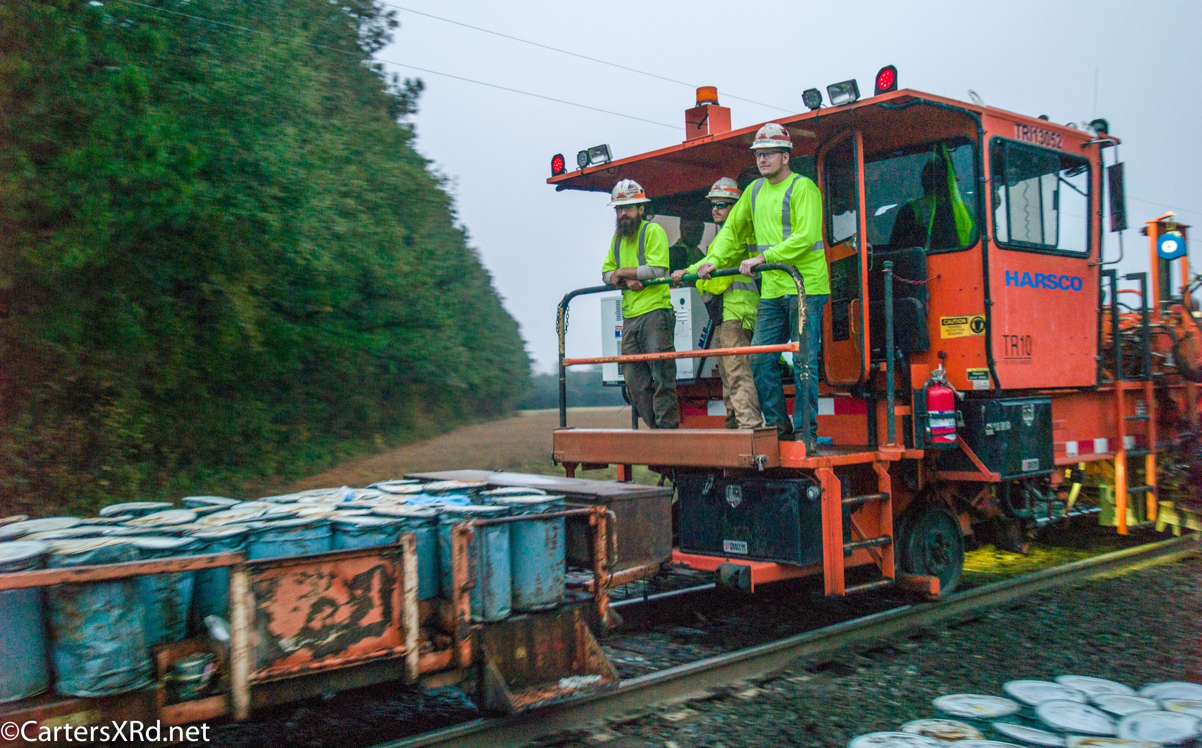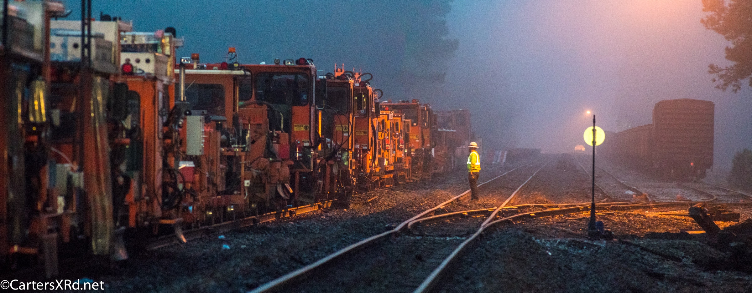 CHOCOWINITY NC — On Saturday November 17, Norfolk Southern’s traveling track crew equipment arrived in town. The train was broken down and distributed around the yard to be ready for Monday’s crew arrival. Monday morning, the crew of nearly 70 men hit the ground, unloaded their train, and cranked up dozens of machines which specialized in some small job that contributed to the finished track work. Each contraption seemed the work of a builder from some unknown place on the scale of madness to genius. This was the week of Thanksgiving, so work had to be finished in three days and the train reloaded if the team was to spend the holiday with their families. They made it. This is condensed gallery. If you are a real railroad fanatic you can find the full galleries here: Setup Weekend, Unload and Day One work, Day Two work, Day Three work and Reload.