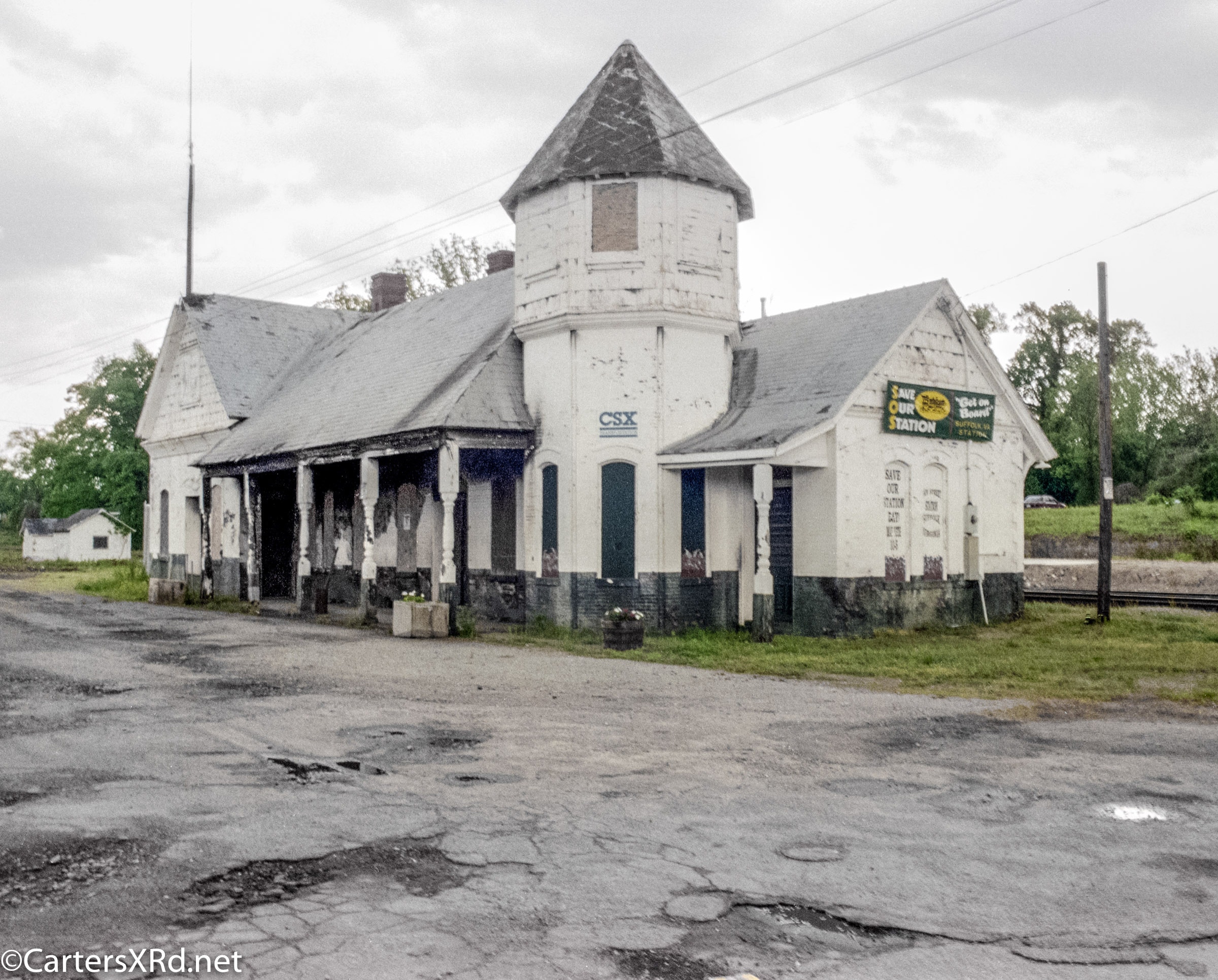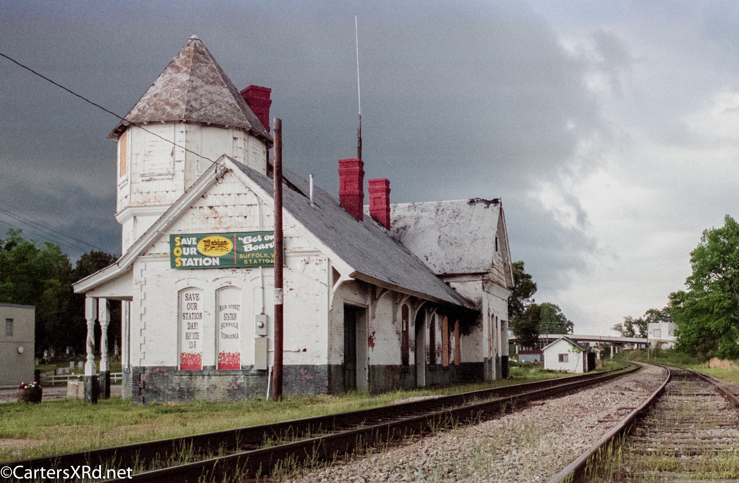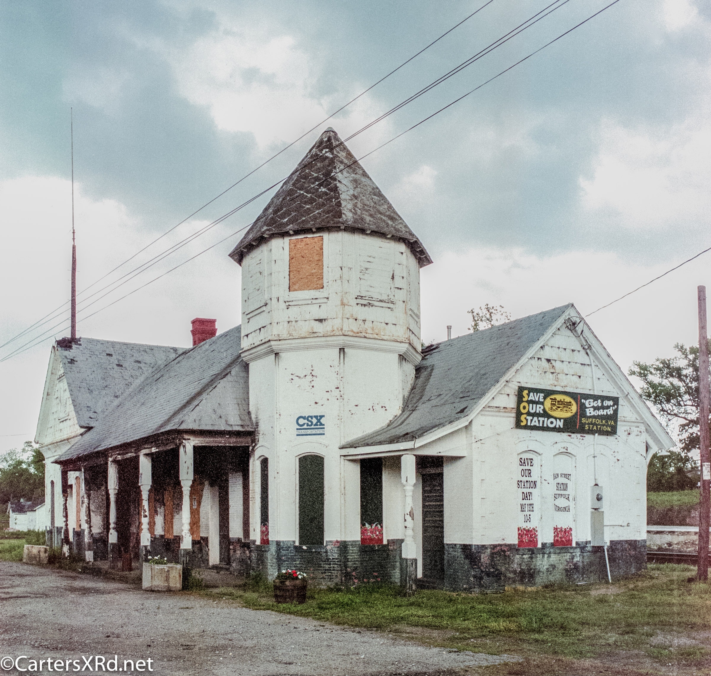 SUFFOLK VA — Suffolk’s passenger station was built in 1885 by Seaboard and Roanoke Railroad. It’s first passengers left the station in 1907 on Virginian’s line. The station continued to serve passengers until 1968. After Seaboard Coast Line merged with Chessie, the station served CSX as a freight office. It burned in 1994 and was nearly lost forever. Local history and rail fans managed to save and refurbish the station. It now is a museum with an outstanding HO railroad model of 1907 Suffolk. I remember boarding a train here in the ‘60s to visit a friend in Henderson NC. It was my first train ride. These photos were taken in 1995.