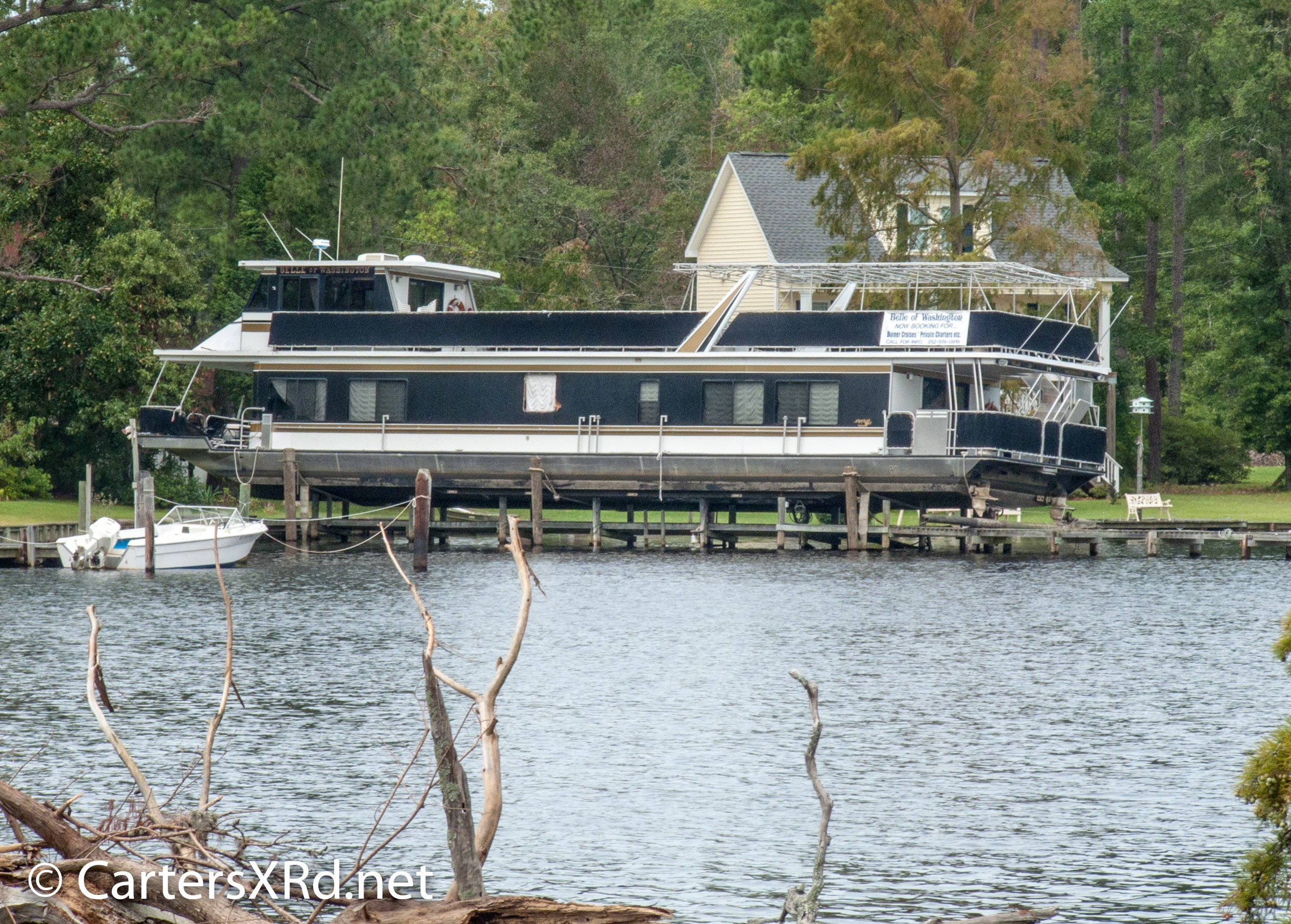 WASHINGTON, NC — It would be cost prohibitive to do this if you really wanted to. But in August of 2011, the owners of The Belle of Washington got it done for free by Hurricane Irene. She was torn loose of her storm moorings and blown onto a pier in a creek outside Little Washington. I took this photo September 5, 2011.