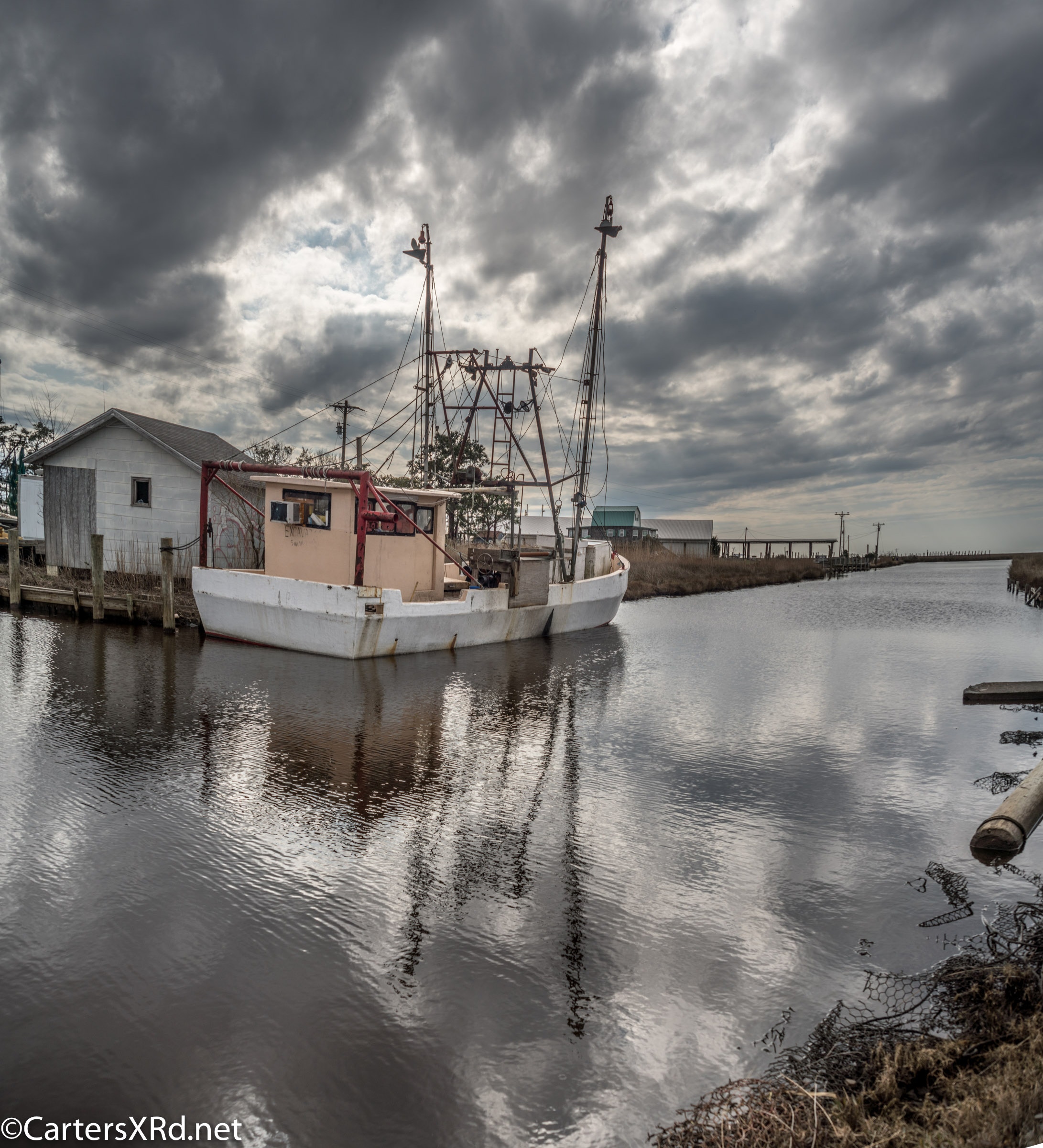 SWAN QUARTER, NC— This boat in Swan Quarter hit me as a unique design, likely conceived and built by a local fisherman. This is in the ditch behind the main harbor that runs along the long pier on the marsh. I took this photo in 2016.