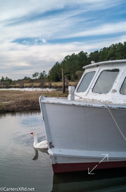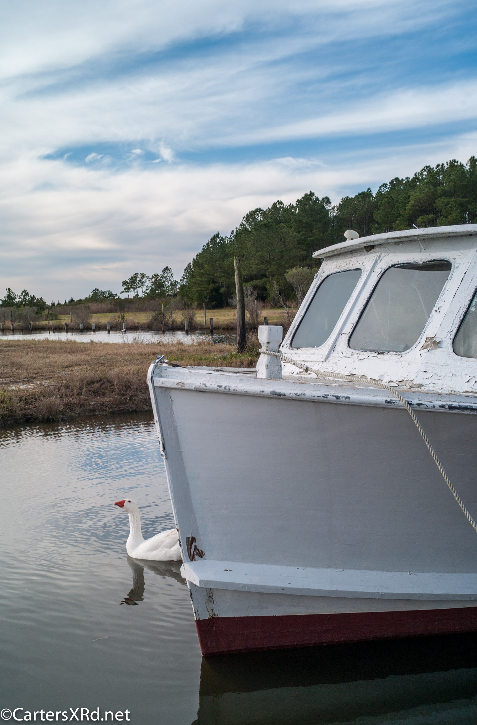 ROSE BAY, NC — This wooden fishing boat seems to have its personal mascot at the dock. A domestic goose is not the usual kind seen in Hyde County, but they are well suited to the community. I took this photo in 2009.